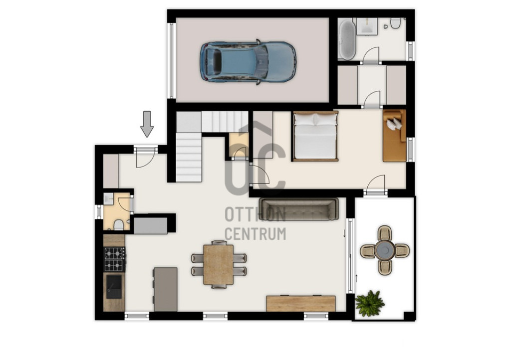 A családi élet központjaként szolgáló nappali-konyha-étkező 40 négyzetméter alapterülettel rendelkezik, amelyhez kertkapcsolattal rendelkező terasz tartozik.