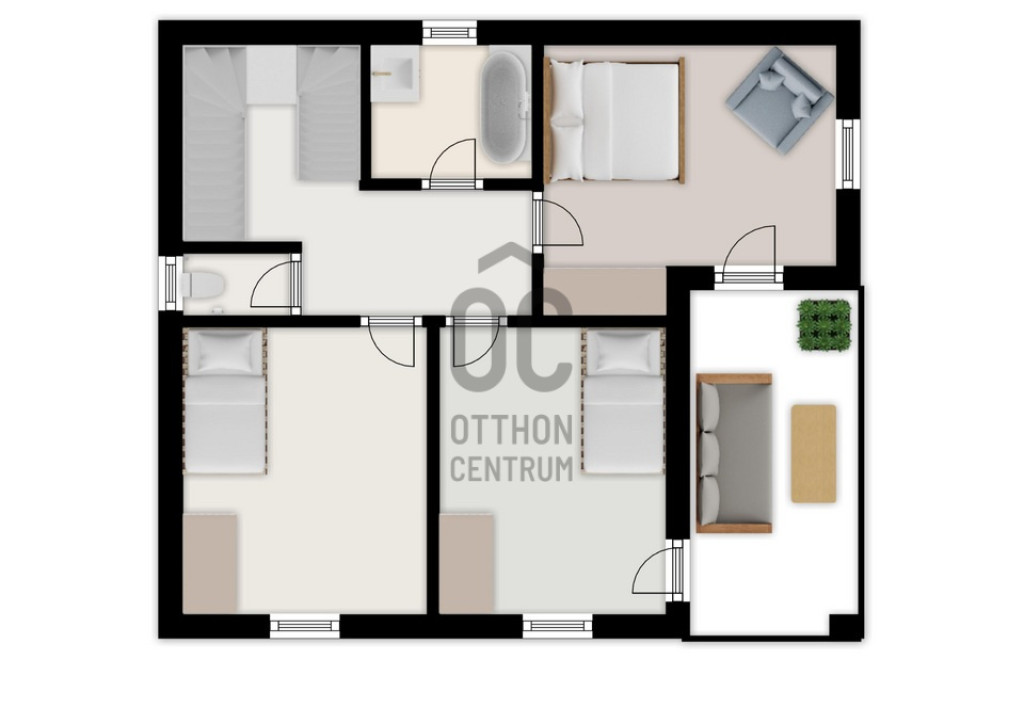 A felső szinten három hálószoba biztosítja az elszeparált életteret, melyekből kettő közvetlen teraszkapcsolattal rendelkezik. Az emeleten külön fürdőszoba biztosítja a privát élettér kényelmet.