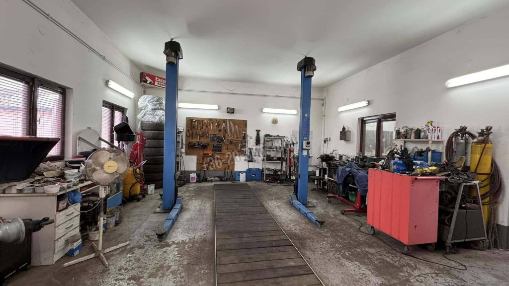 • Egy 140 m²-es, teljesen felszerelt autószerelő műhely, irodával, mosdóval és öltözővel