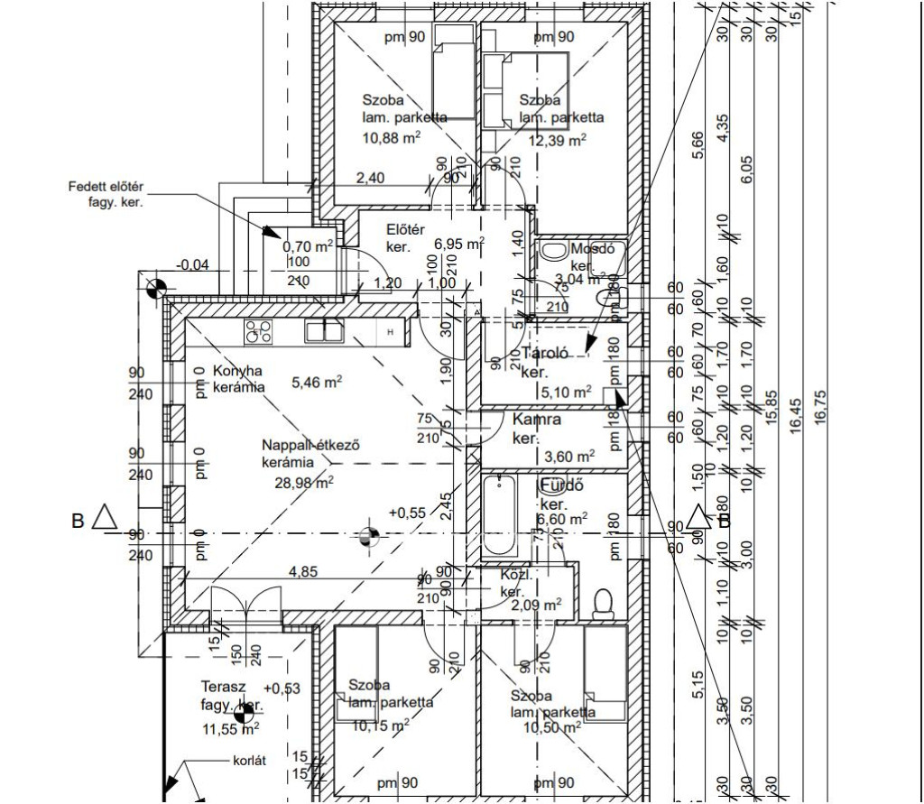 Az előszobából nyíló helyiségek két szoba, mosdó, háztartási helyiség , praktikus napi kényelmet adnak, míg a világos nappali,étkező,konyha a családi élet szíve. Innen elérhető egy kamra, valamint egy közlekedőn át további két hálószoba és egy kényelmes fürdőszoba.