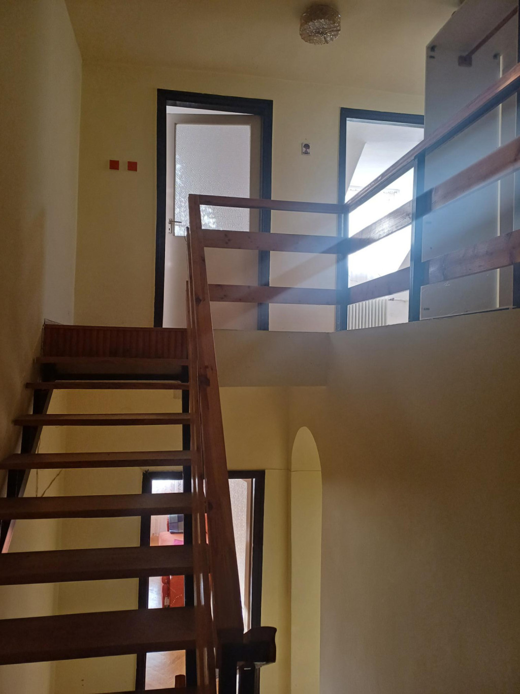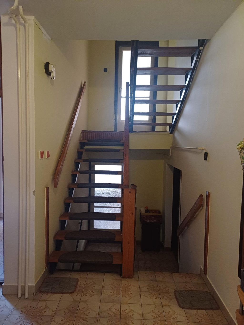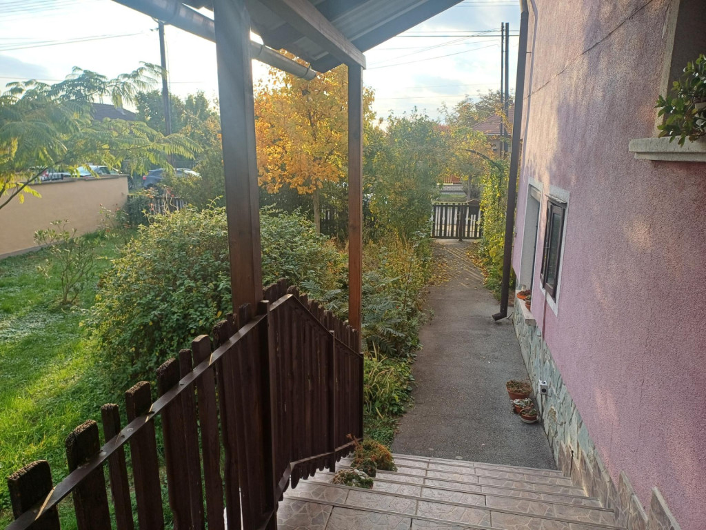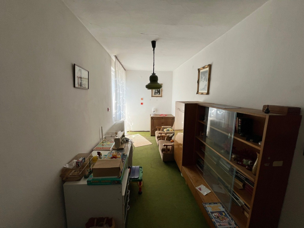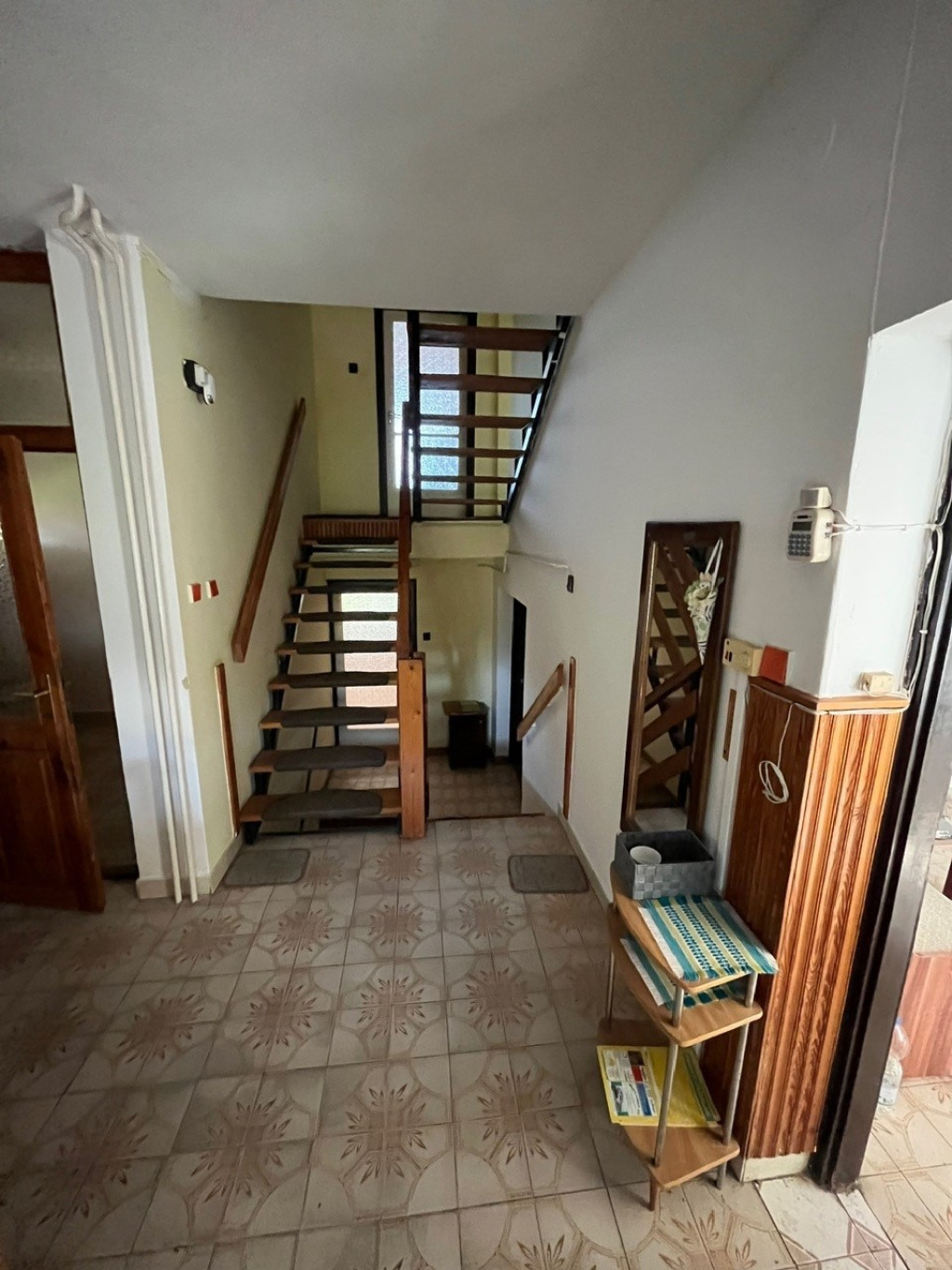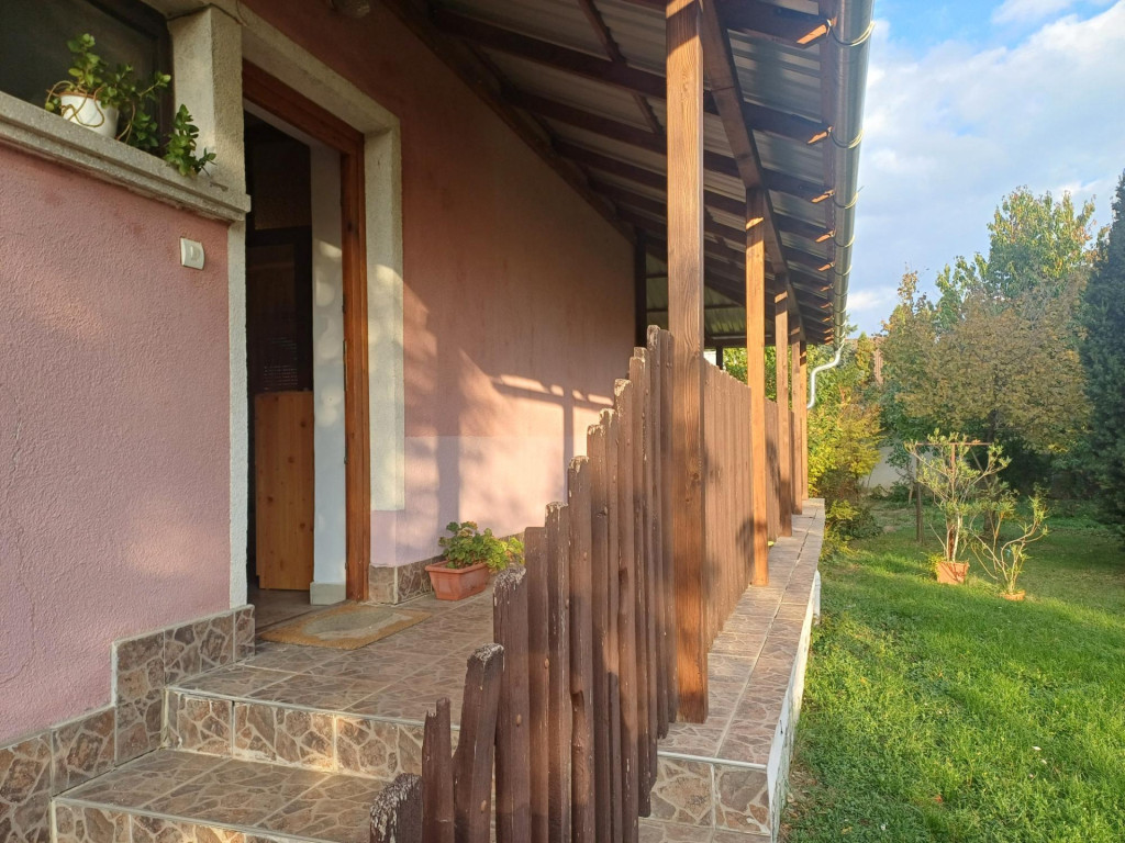 A főbejáraton keresztül a házba belépve az előszobába érkezünk meg. Innen nyílik a fürdőszoba, a garázs, míg az előszoba végén bejutunk a konyhába -étkezőbe, iiletve a félemeleten található szobába és mellette fürdőszobába.. A ház átlagos állapotú, ezidáig lakott volt. Festés és kisebb javítási munkák után egy élhető otthont kapunk. A tetőn cserép található, a nyílászárók fa szerkezetű gerébtokos ablakok. A beltéri ajtók fából készültek. A járólapok a parketták a szobákban átlagos állapotúak. A konyhabútor szintén átlagos állapotú és tágas. Az előtér és az étkezőből építették meg a fém és fa szerkezetű lépcsőfeljárót a felső emelethez. Az étkezőből tudunk kilépni a hátsó teraszra fa szerkezetű amit pergolával látták el.