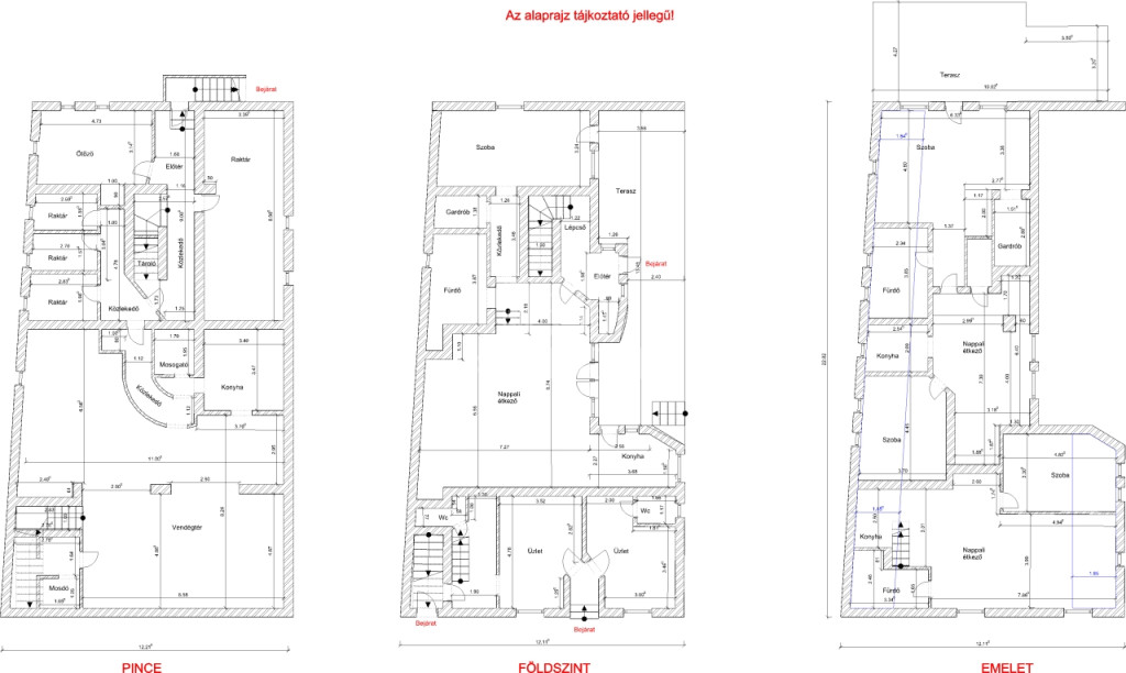 Földszint: 151,6 nm2 (Lakás:110,4 nm2, utcafronti üzletek összesen:41,2 nm2)+ terasz:45,85 nm2.