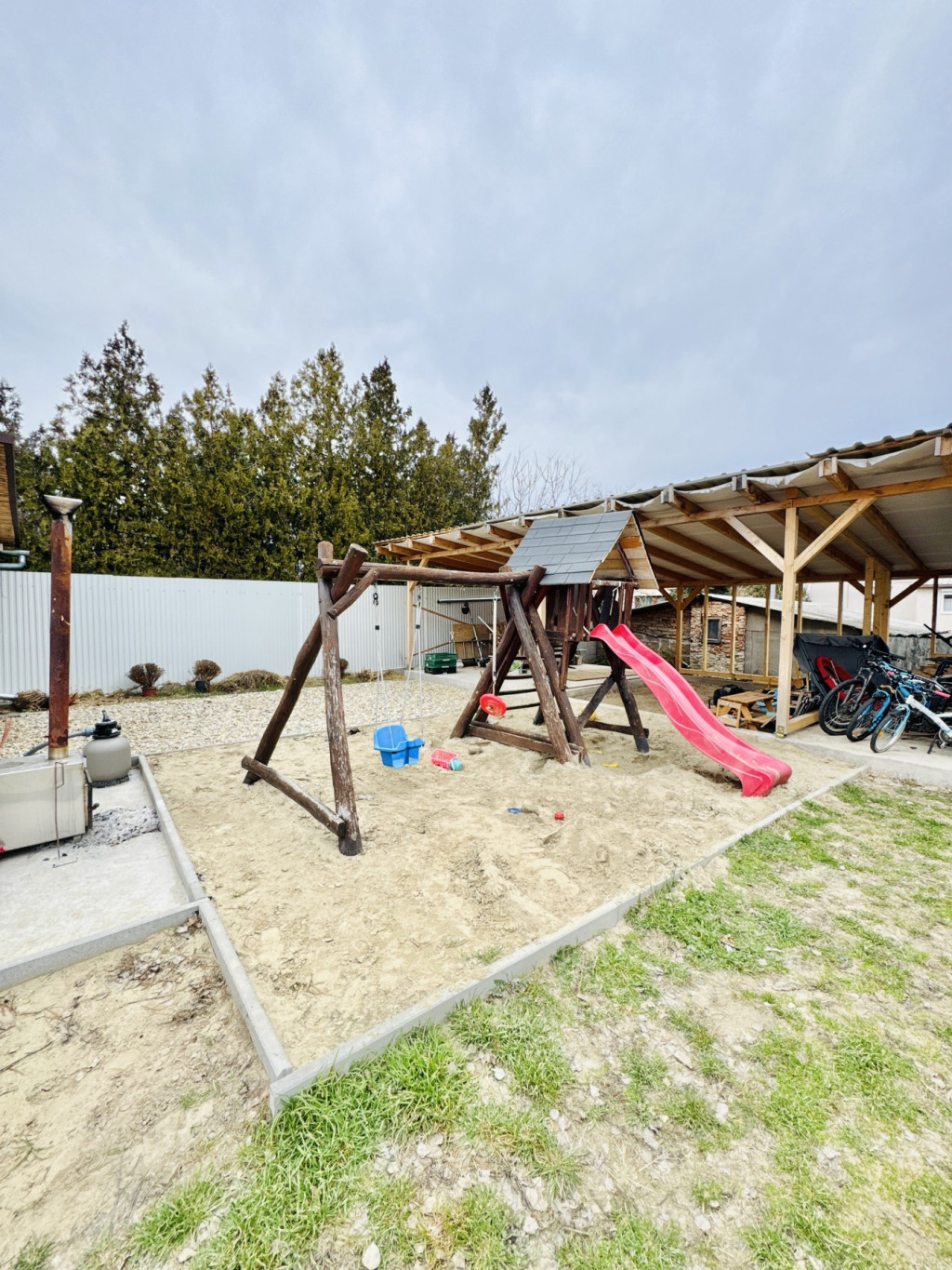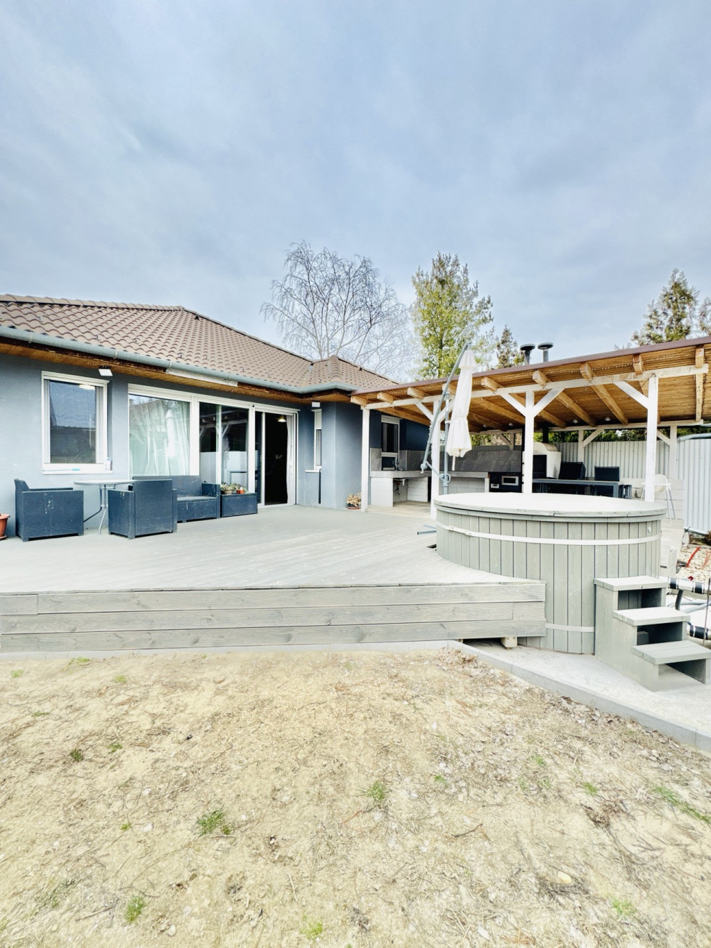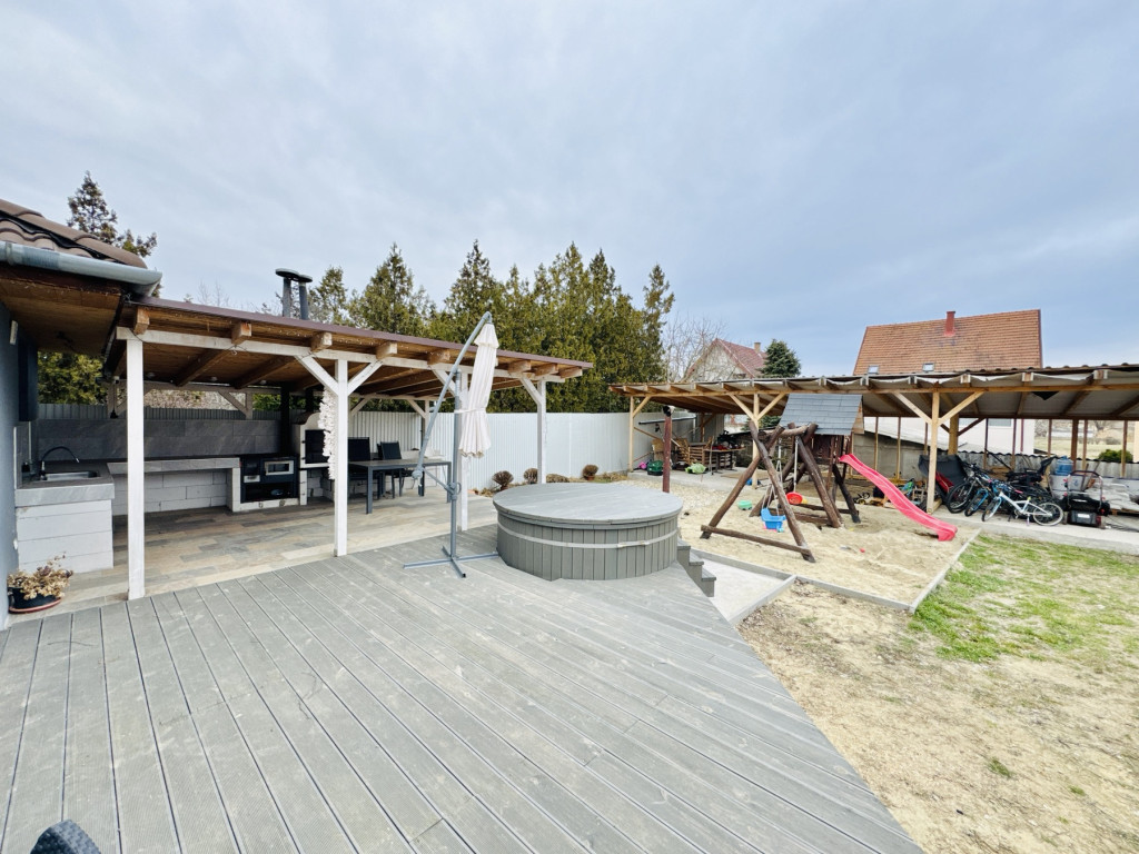 A kertben kialakított pihenőzóna és a dézsafürdő igazi kikapcsolódást biztosít, a tágas udvar pedig ideális családi programokhoz vagy akár további fejlesztésekhez.
