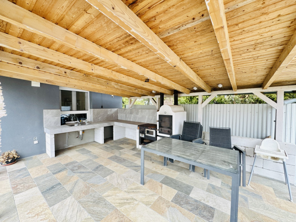 - nagy terasz fedett sütögető résszel és kemencével