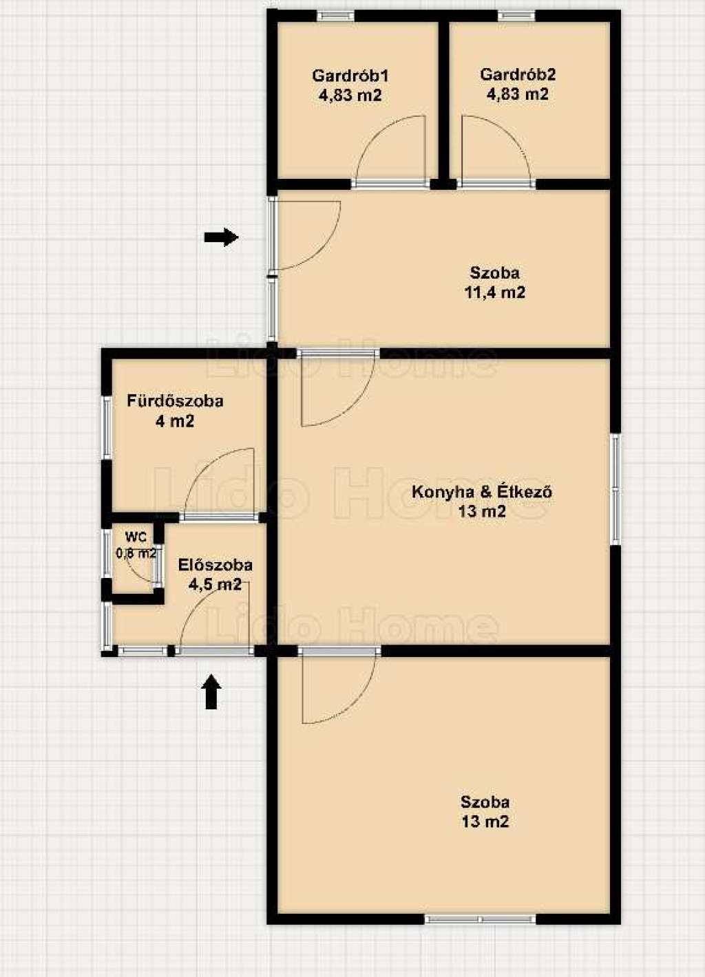 Az 57 négyzetméteres lakótér 2 bejáraton közelíthető meg.