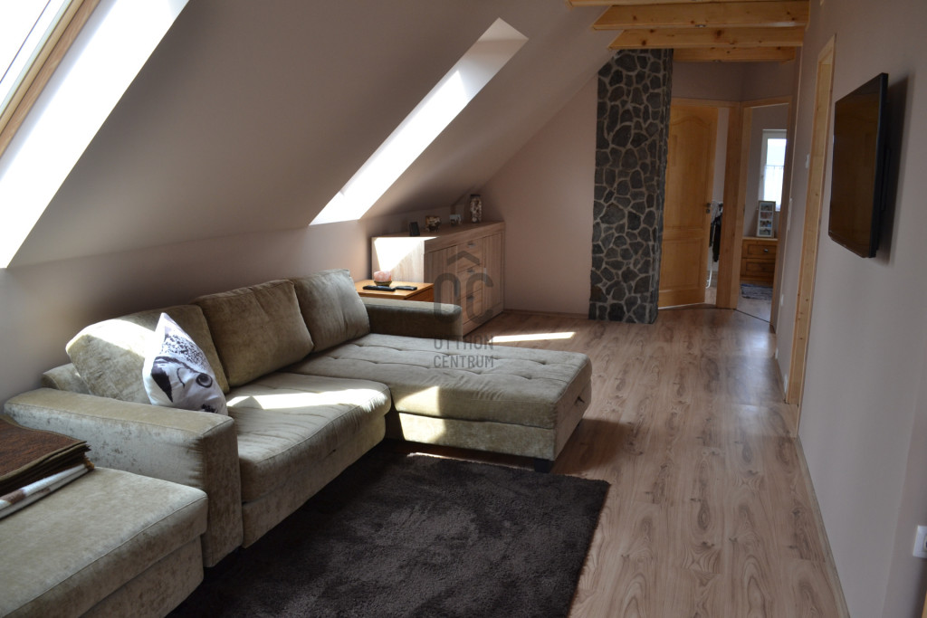 A konyha és étkező rendelkezik egy saját kis tárolóval, elektromos padlófűtéssel. A felső szinten található a fürdőszoba, a nagy méretű nappali és a két szoba. A fürdőben elektromos padlófűtés van, a többi helyiségben infra padlófűtés. Az egész szint fűthető, hűthető egy 3,5KW-os klímaberendezéssel. Itt található egy bazalt kővel burkolt kémény lemezkandallóval. A tűzifatároló az erkélyen található, amely igény esetén könnyen beépíthető egy plusz szobává. A lakás összesen körülbelül 70 négyzetméter, amely további körülbelül 50 négyzetméterrel a tervek alapján bővíthető.