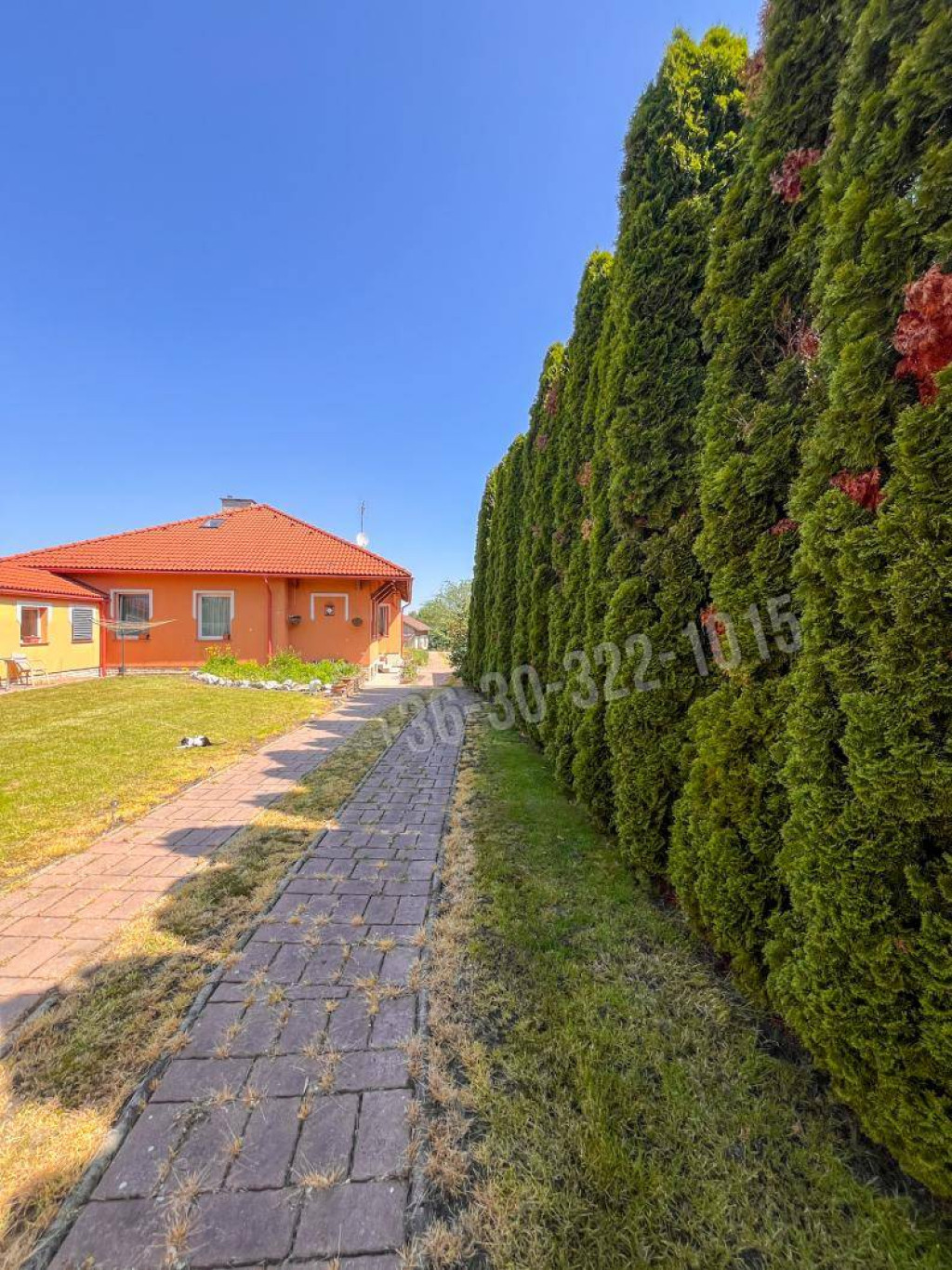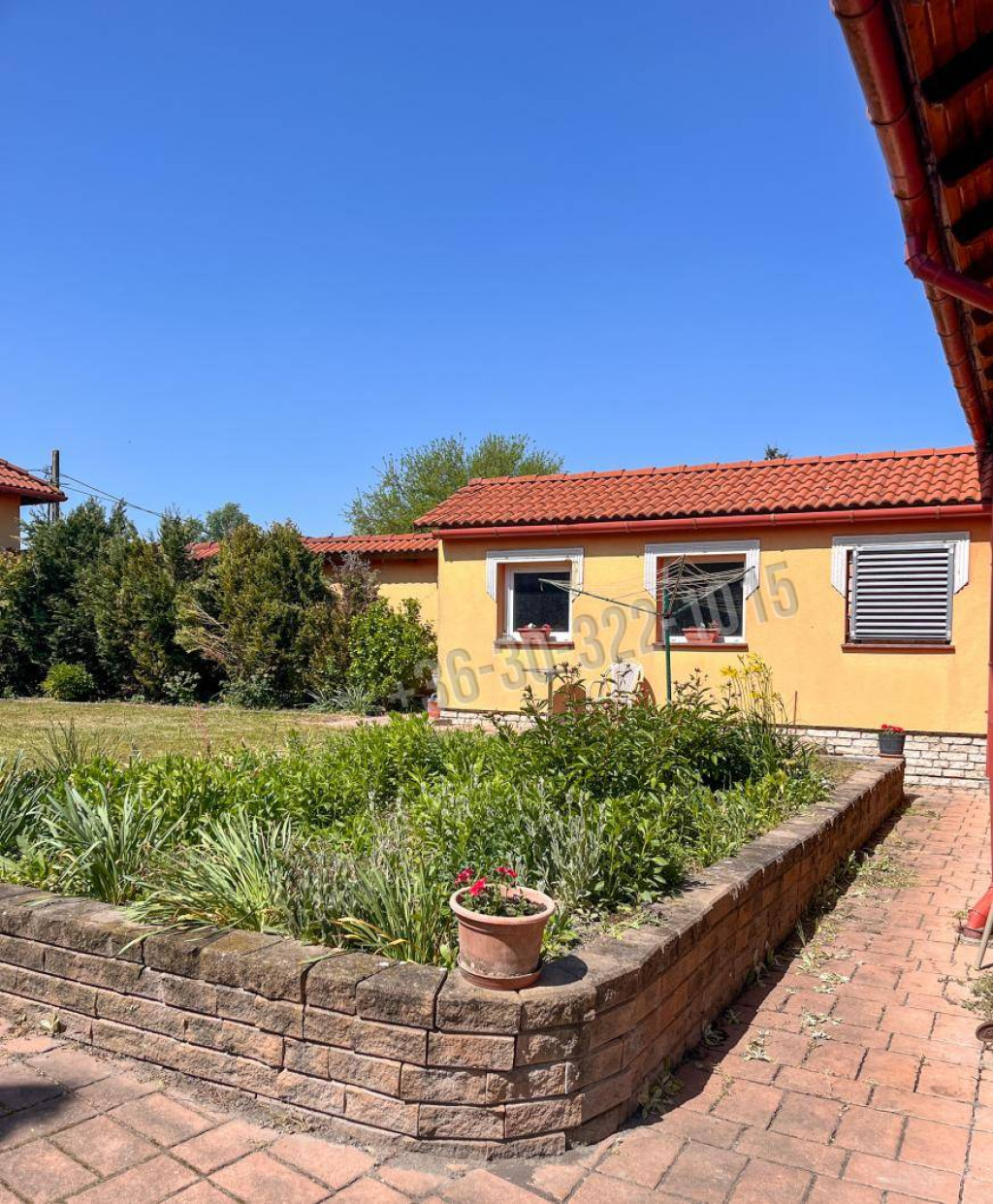 Az ingatlanhoz tartozó 1171 négyzetméteres belső udvar egyedülálló környezetet biztosít, ahol a természet és a kényelem harmonikusan egyesül. A tervezés és kialakítás minden részletére odafigyeltek, hogy kellemes és élvezetes helyszínt nyújtson a lakók és látogatók számára. Az udvart magas tuják és elegáns tégla kerítés veszi körül, amelyek intimebb és meghittebb légkört teremtenek, miközben védett érzetet biztosítanak. A gondosan parkosított területek és a megválasztott növényzet hozzájárulnak az udvar szépségéhez és ápoltságához, míg a térkövezett részek egyszerű karbantarthatóságot biztosítanak, így az udvar mindig rendezett és vonzó marad. Az öntözést fúrt kútról biztosítják, ami hatékony és fenntartható megoldást jelent a növények frissességének megőrzésére, csökkentve ezzel a vízfelhasználást és a költségeket.