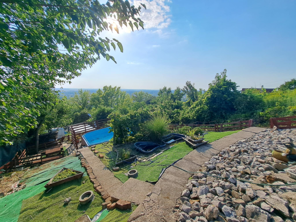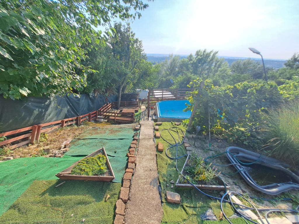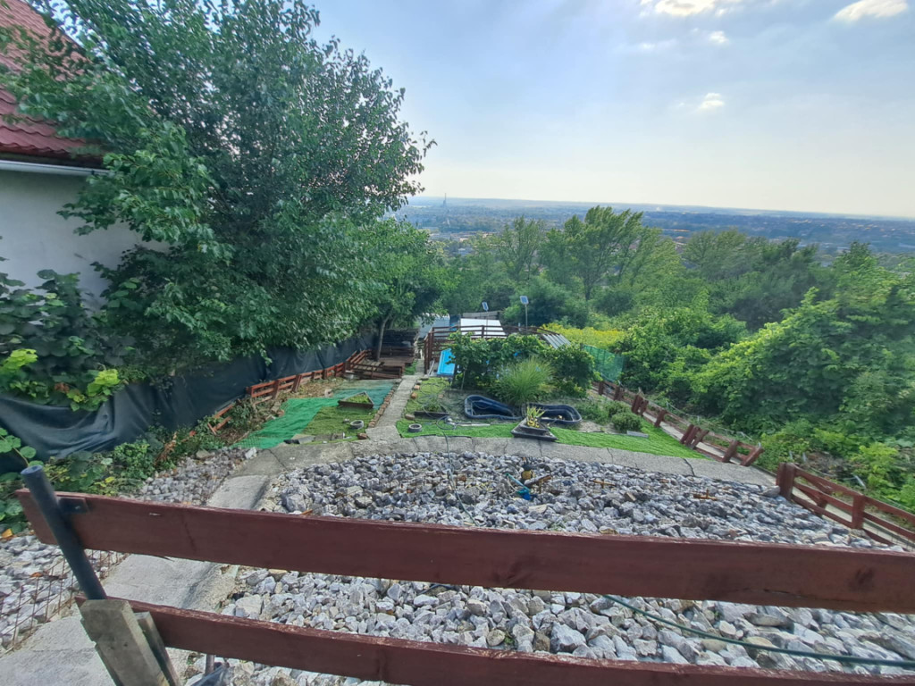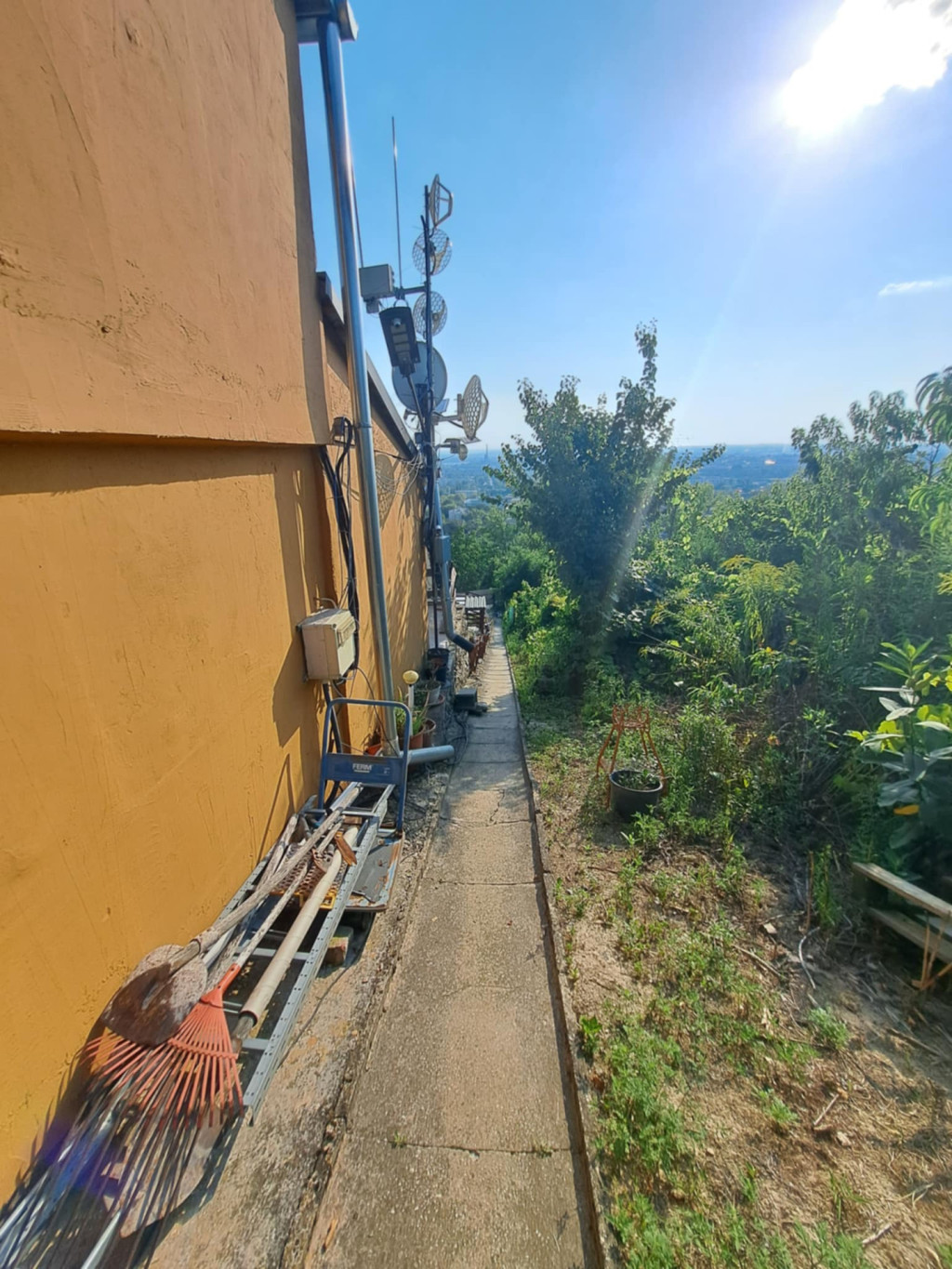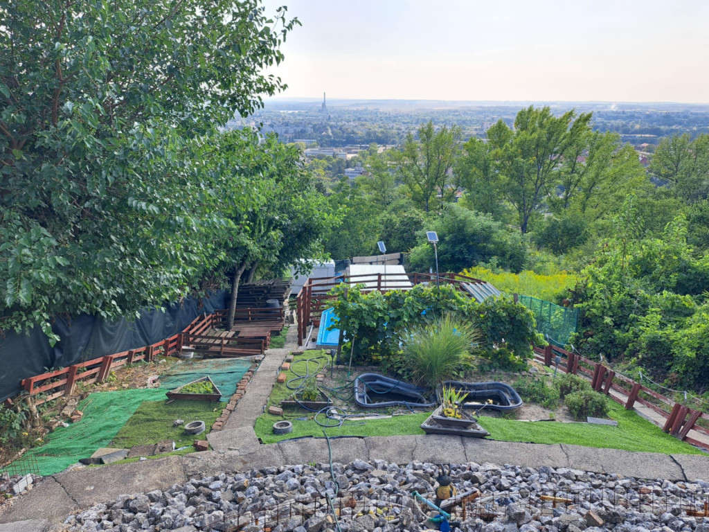 Az ingatlan két irányból is megközelíthető. Az egyik oldalon elektromos kapu is biztosítja a bejutást. A házhoz egy hatalmas terasz tartozik, csodás kilátást biztosítva a városra. A kert egy része parkosított, ahol medence, kerti kiülő, sütögető ad lehetőséget a pihenésre és feltöltődésre, másik részét veteményes, magaságyások, gyümölcsfák, számtalan virág és növény díszíti.