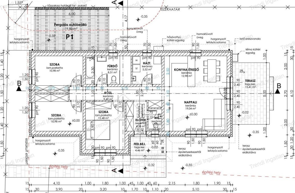 Az ingatlan remek elosztású, melyben amerikai konyhás nappali, 3 szoba, fürdőszoba WC-vel, külön WC, háztartási helyiség, közlekedő, előtér került kialakításra. Nappaliból nyílik 15,41 nm-es terasz.