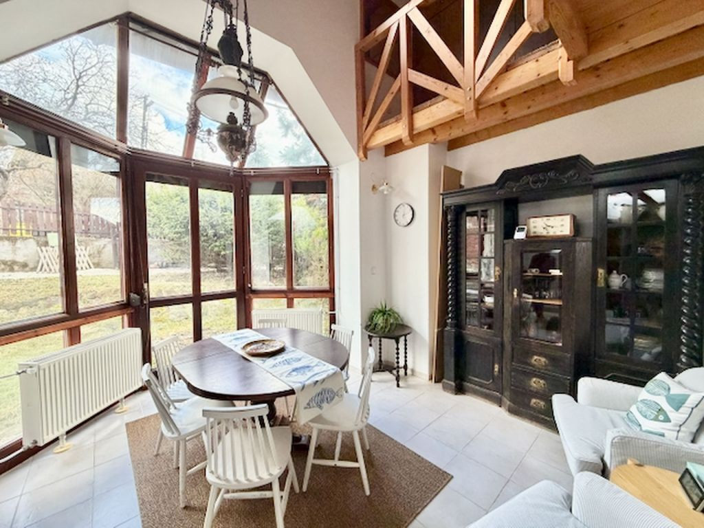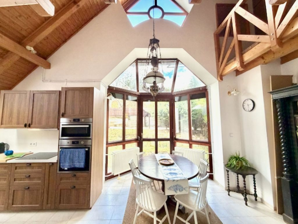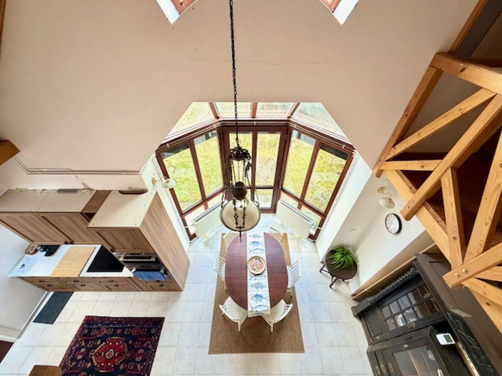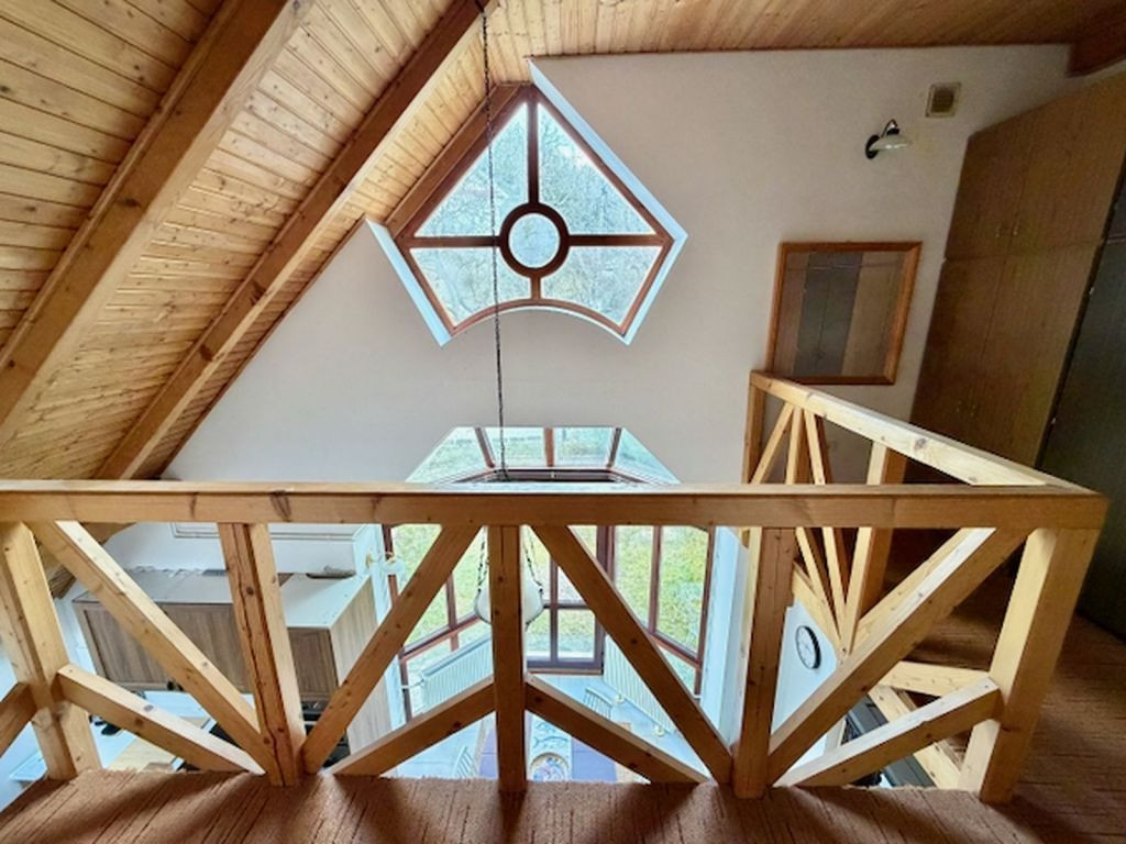 A földszint és a beépített tetőtér praktikus, jól szeparált élettereket biztosít. A nappali hangsúlyos belmagasságát a felső szint intimebb hálóterei ellensúlyozzák, így az elrendezés arányos és jól élhető. A fürdőszoba igényesen felújított, modern, visszafogott kialakítású. A nappalival egy légtérben kialakított konyha jól használható, praktikus elrendezésű, beépített gépekkel.