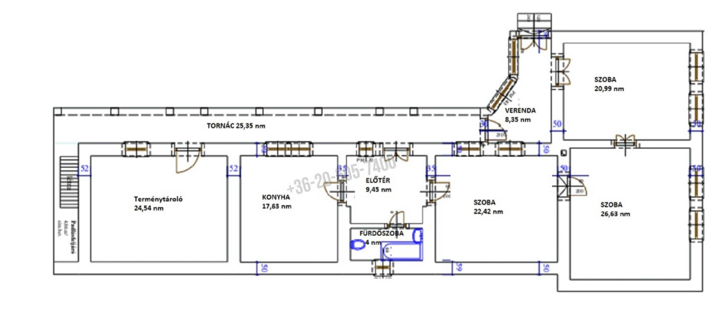 Az ingatlan helyiségei: 3 szoba, konyha, két előtér és fürdőszoba. Teljes közművel rendelkezik: gáz, villany, víz és csatorna bevezetve. A fűtést gázkonvektor biztosítja, jelenleg egy szobában található készülék. A villamos hálózat 3×20 A-es kapacitással rendelkezik.