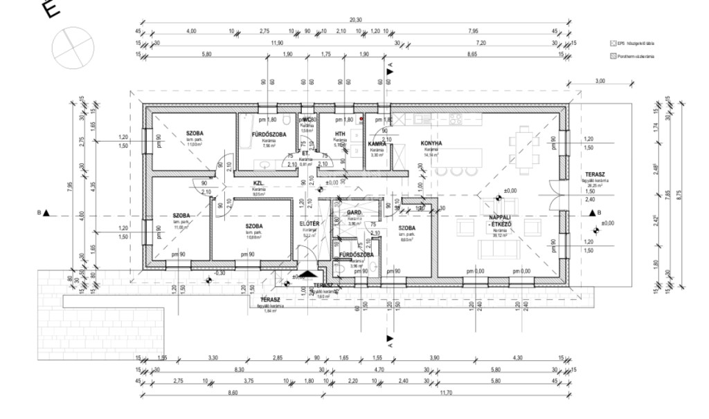 Helyiségei: Előtér 4,6 nm, amerikai konyhás nappali teraszkapcsolattal 51,9 nm (fedett terasz 25,5 nm), 4 lakószoba egyenként 9,3 nm, 10,5 nm, 10,5 nm, 10,9 nm, fürdőszoba káddal zuhannyal 7,2 nm, fürdőszoba zuhanyzóval 3,8 nm, mosókonyha 5,6 nm, gardrób 3,6 nm, közlekedő 11,1 nm, kamra 5,3 nm, wc 1.1 nm.
