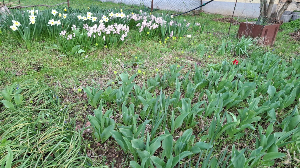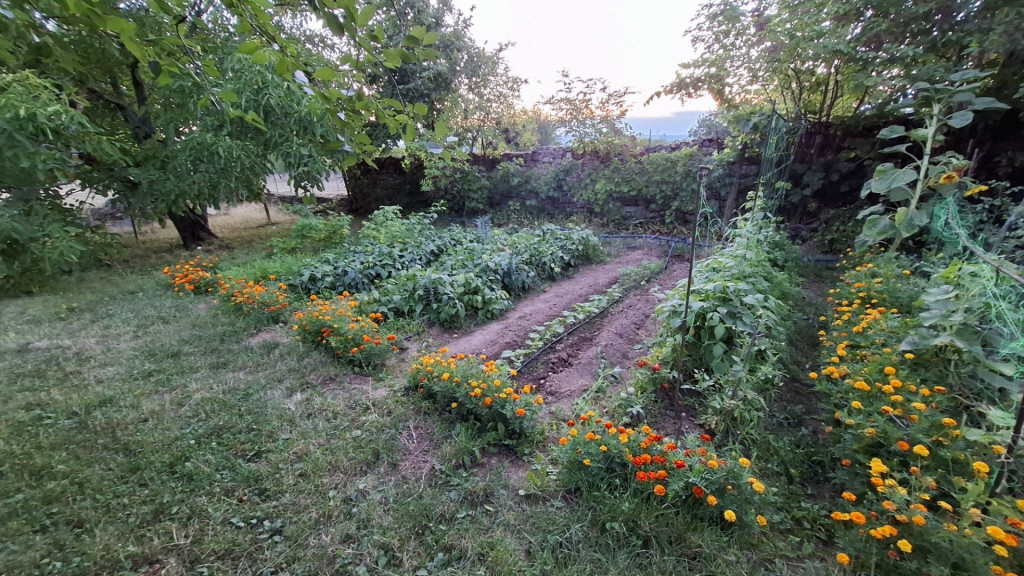 A hatalmas kert igazi kincs: cseresznye, meggy, alma, szilva, ringló, dió, füge, szőlő és mogyoró terem benne, mindez IBC tartályos esővízgyűjtővel és automata öntözőrendszerrel támogatva. Ipari áram bekötése is megtörtént.