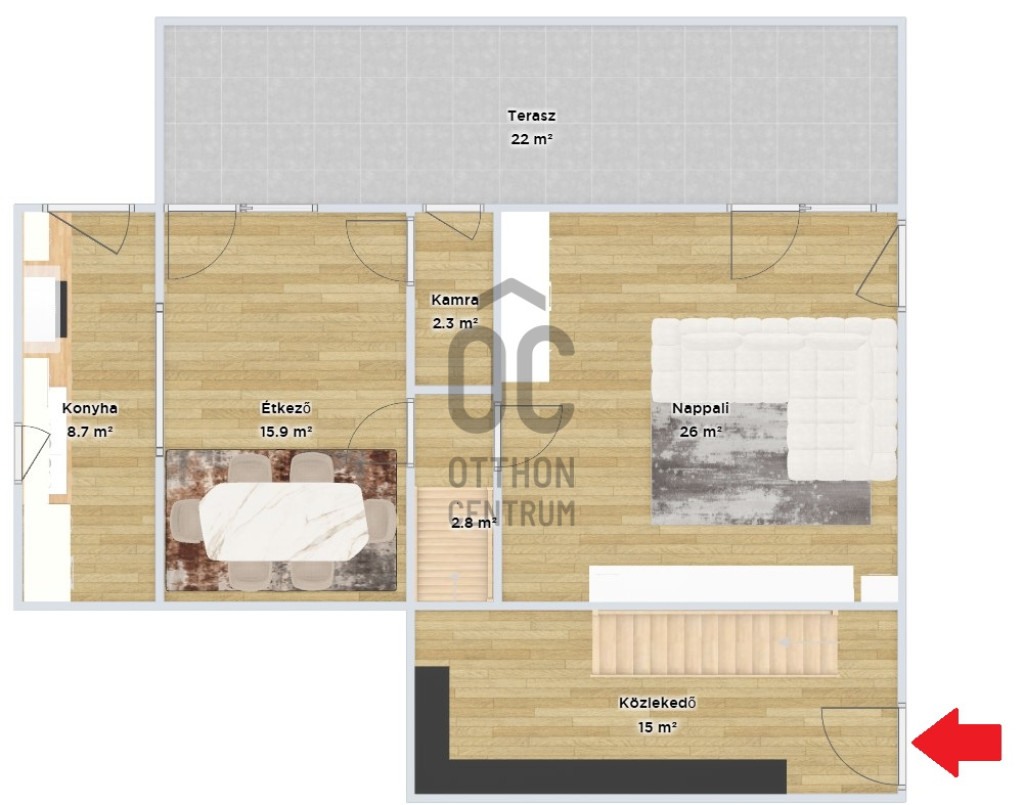 A tágas nappali világos és barátságos légkört biztosít, ahol kellemes estéket tölthet el szeretteivel.