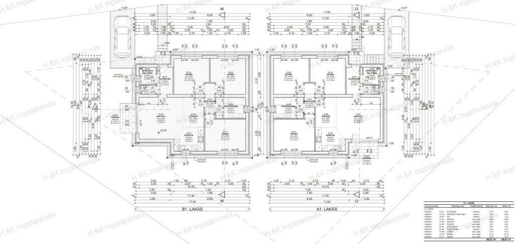 Az 1088 nm-es telekre két családi ház épül, melyek nettó lakóterülete 87 nm + 12 nm terasz, amerikai-konyhás nappali + 3 szobás elosztással.