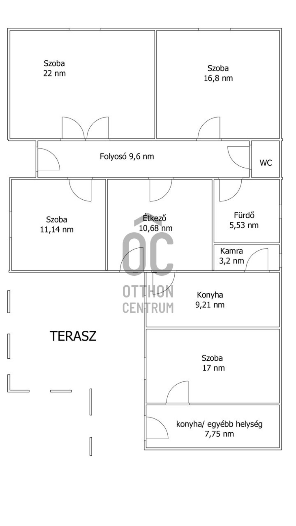 Elrendezése: 3 szoba, konyha+étkező, folyosó, fürdőszoba+wc.