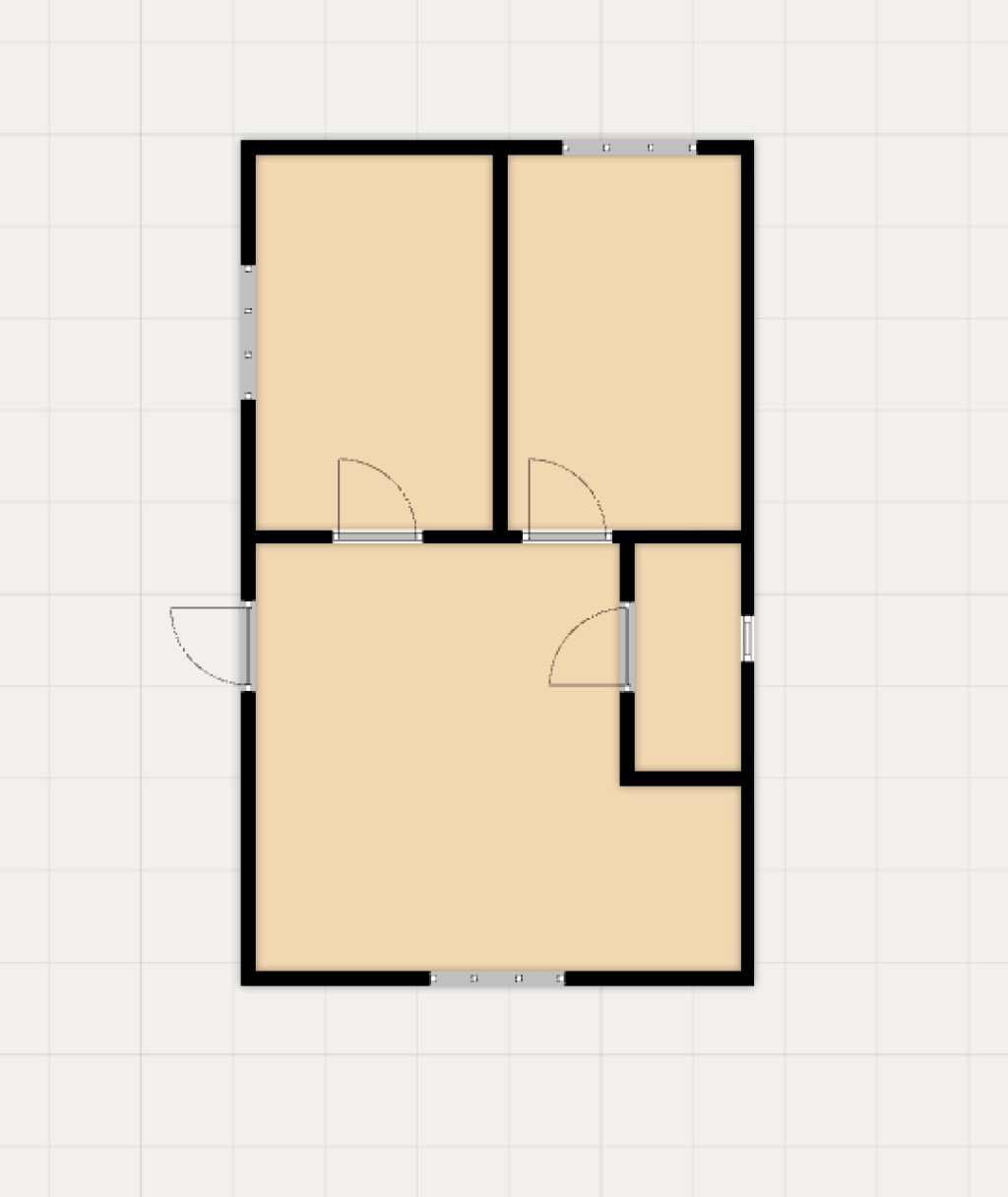 Helyiségek: étkező–nappali–konyha, 2 szoba, fürdőszoba.