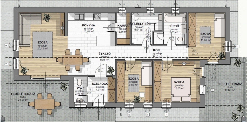Az ingatlan 3 szoba + nappali elrendezésű, a terasz kellemes lehetőséget biztosít pihenésre, valamint a nappali természetes meghosszabbításaként szolgál a jó időben.