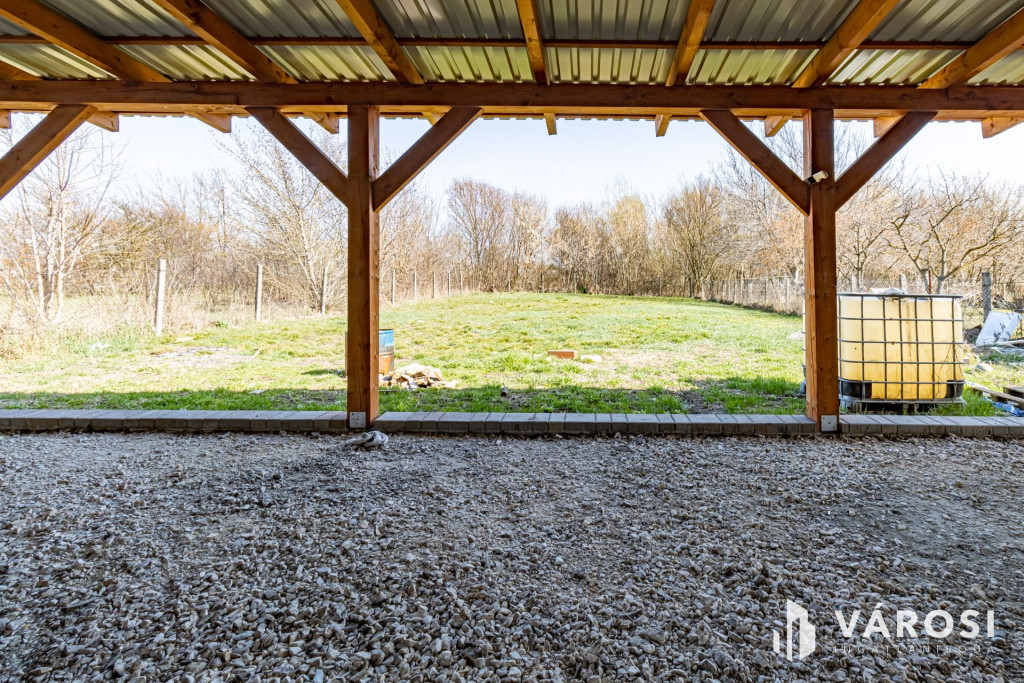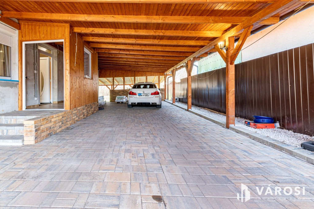 Körbekerített 977 m2-es telekkel, a ház előtt 95 m2-es, térkövezett, fedett autóbeállóval és az épület mögött, hasonló méretű, további fedett terasz előkészítéssel.
