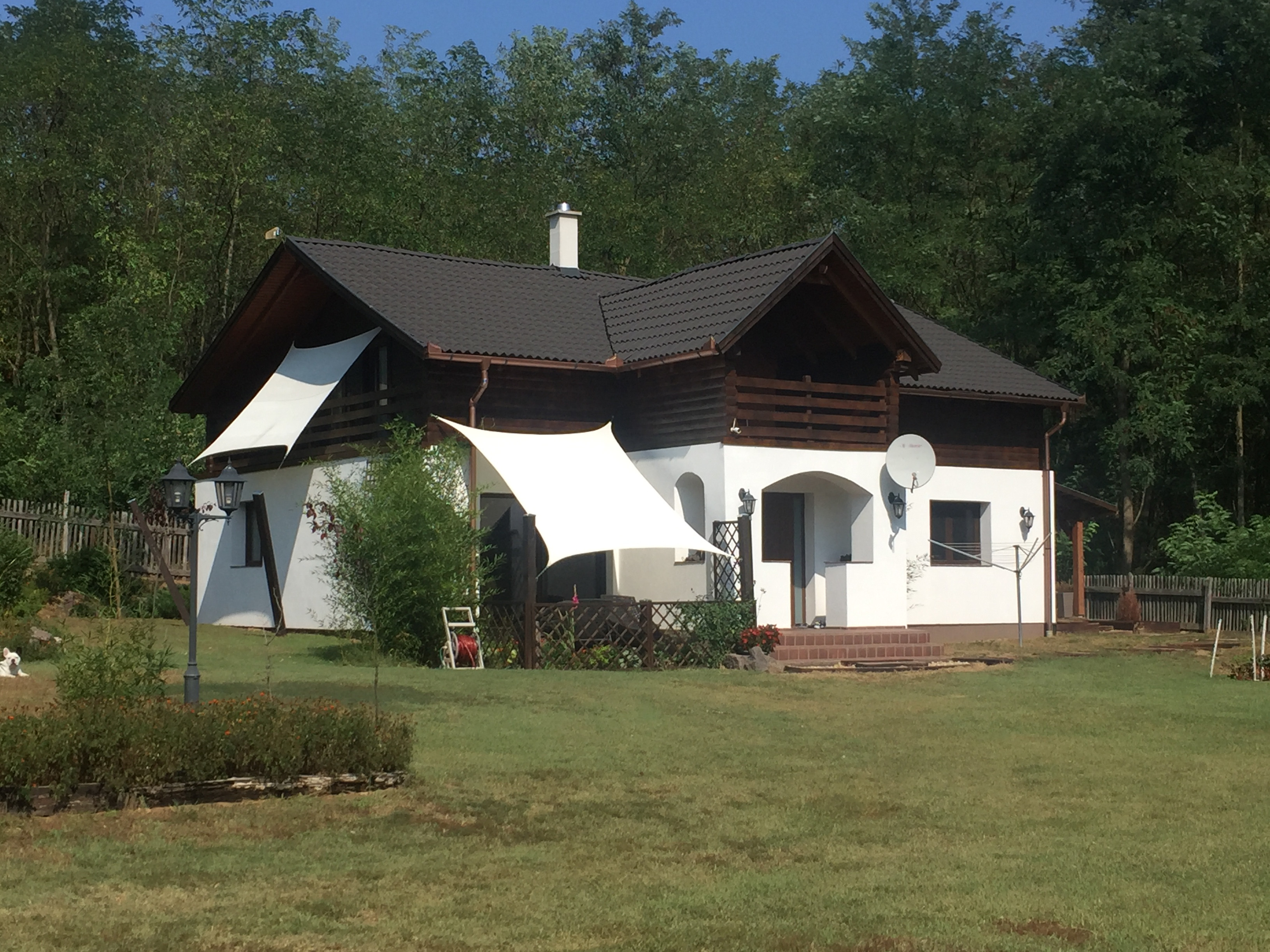 Gyönyörűen kialakított klasszikus, kétszintes ECO családi ház bruttó 320 m2, amely 12.000 m2-es területen helyezkedik el, saját erdővel, szomszédok nélkül, magán úttal. CCTV Biztonsági kamera rendszerrel felszerelve minden iranybol. Csak villanyszamla egyebkent szamlak nincsenek!