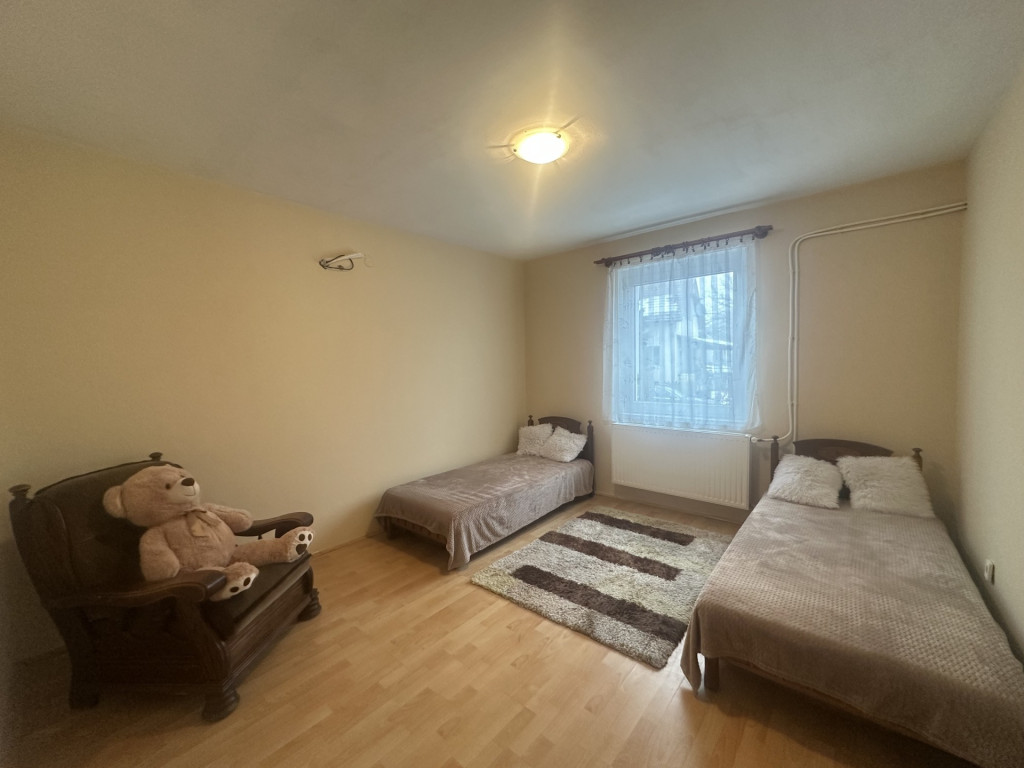 Szobák laminált lappal, minden közös helység kerámia burkolattal rakott.