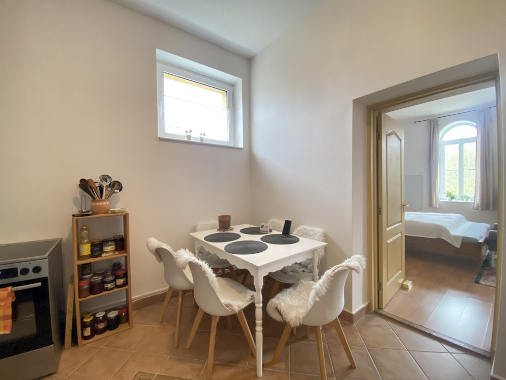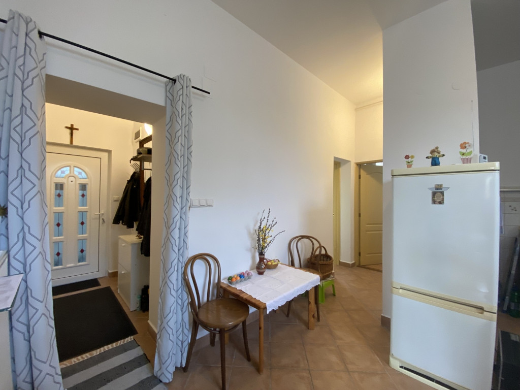 A fűtésről és a meleg vízről kombi gázkazán gondoskodik. Az 55 cm vastag falaknak köszönhetően a lakás nyáron kellemesen hűvös marad.