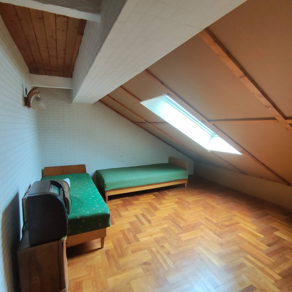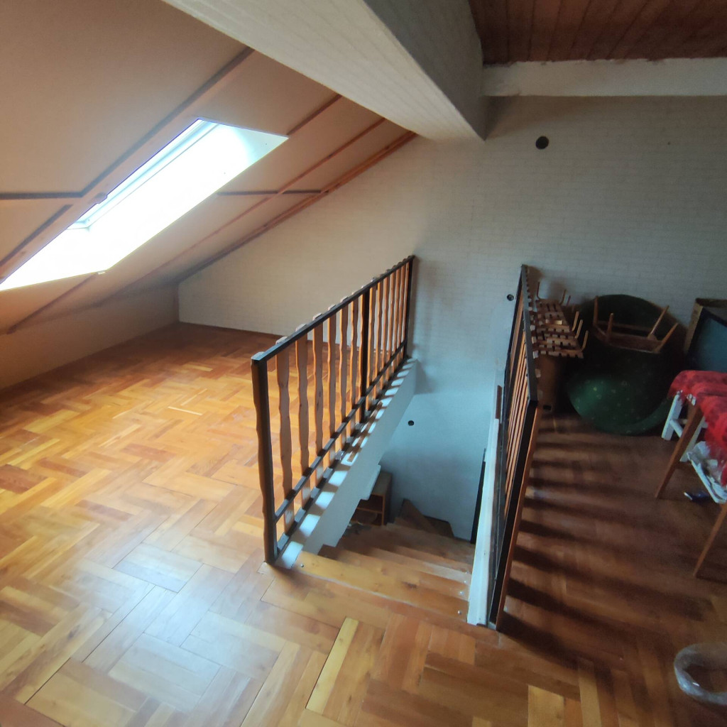 A tetőtérbe a nappaliból vezet fel a lépcső. Itt kialakításra került egy szoba, gardrób helyiség és egy fürdőszoba.