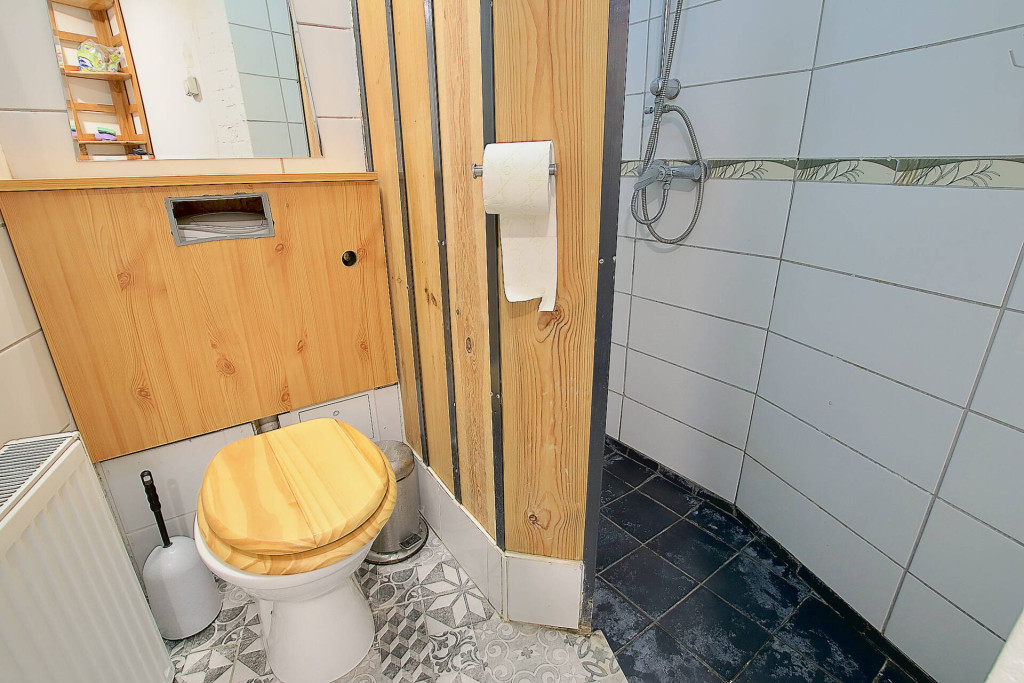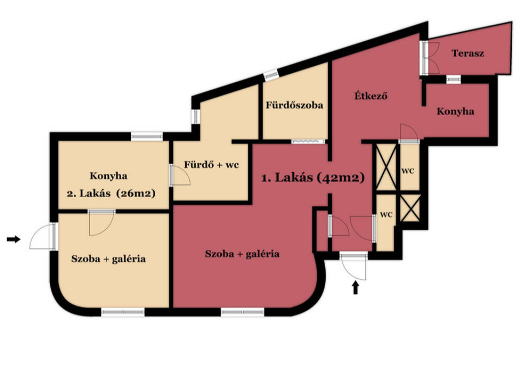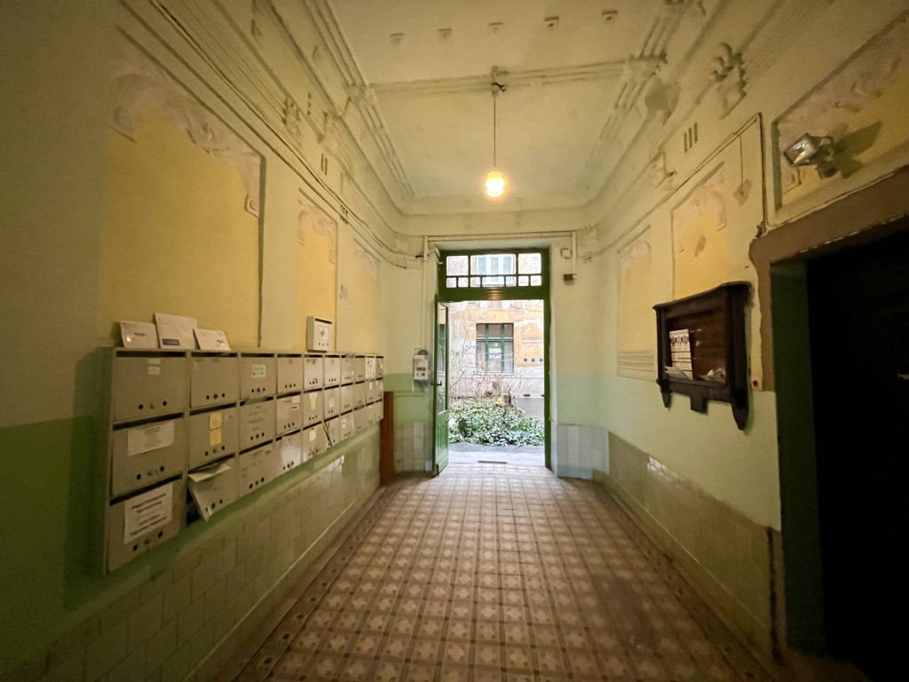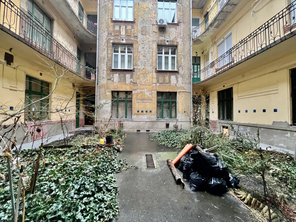 A jelenlegi, kettéosztott állapot 6 éve lett megvalósítva. Cserélve lettek a vezetékek (víz, villany, gáz), új nyílászárók kerültek be, ill., az egyik fronton a régi nyílászárók lettek korszerűsítve. A lakás egy kisebb garzonból (26m2) és egy teraszos 1 szobás (42m2) lakásból áll. Az eredeti állapot is könnyedén visszaállítható, de jelenlegi formájában is jól hasznosítható. Esztétikai felújítást igényel a lakás.