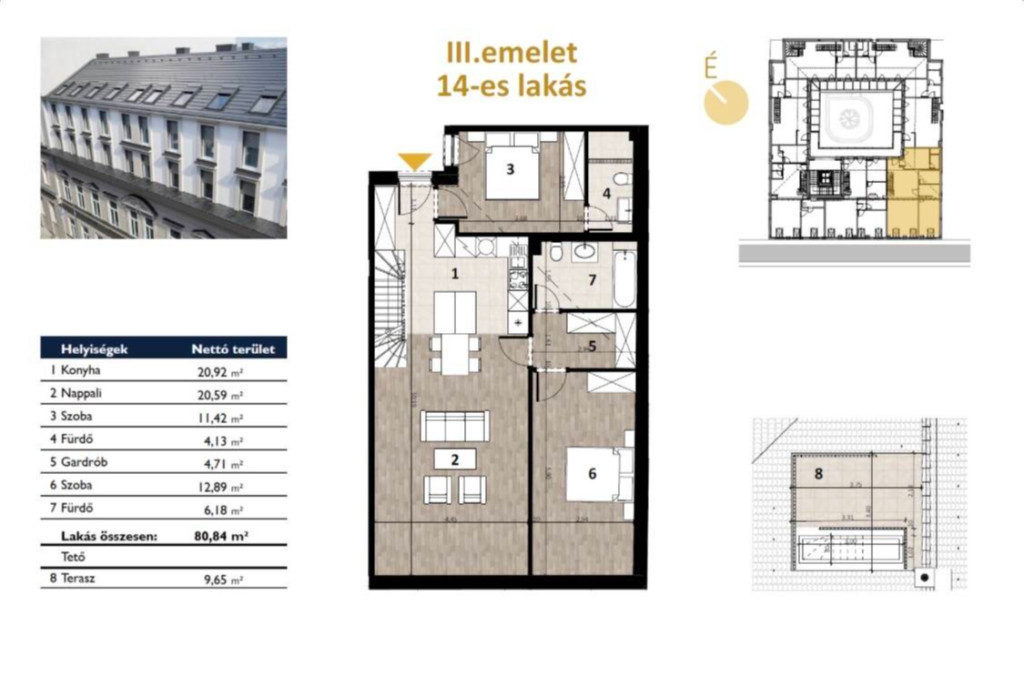 Ez az ingatlan a 3.emeleten található, 81 m2 hasznos alapterületű, 3 szobás lakás, 9,65 m2-es tetőterasszal.