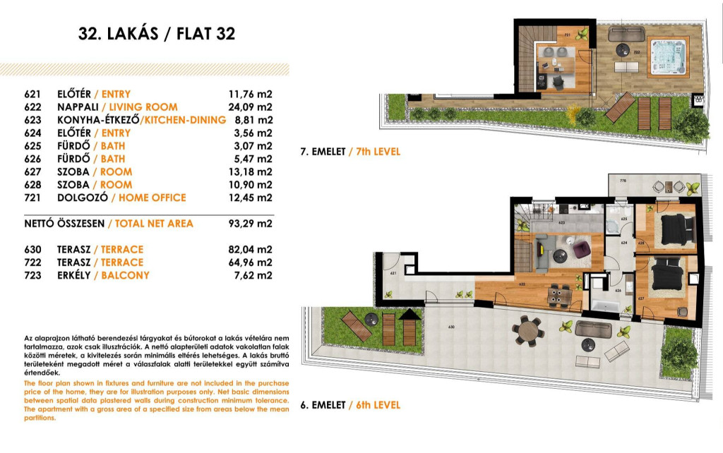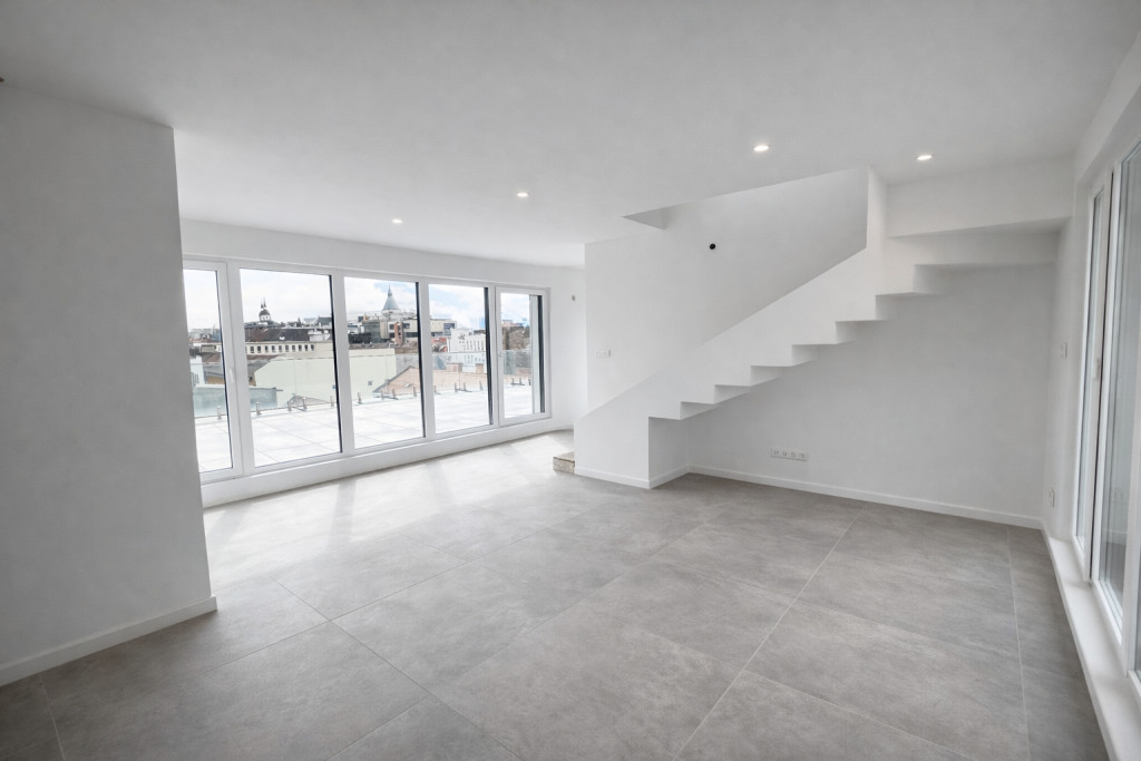A belső kétszintes kialakítású lakás a 6. és 7. emeleten található, amely 93,28 m² lakótérrel és összesen 155 m²-nyi, lenyűgöző panorámás terasszal rendelkezik, amelyekről páratlan kilátás nyílik a Gellért-hegyre és a Hármashatár-hegyre, így a városi élet és a természet látványa egyszerre élvezhető. A 4 szobás otthon rendkívül világos, köszönhetően a DNY–DK–ÉK tájolásnak, így a napfény egész nap természetes módon járja át a tereket. Elosztása praktikus, az alsó szinten egy előtér, amerikai konyhás nappali, két szoba, két fürdőszoba, a felső szinten pedig egy nappali kapott helyet.