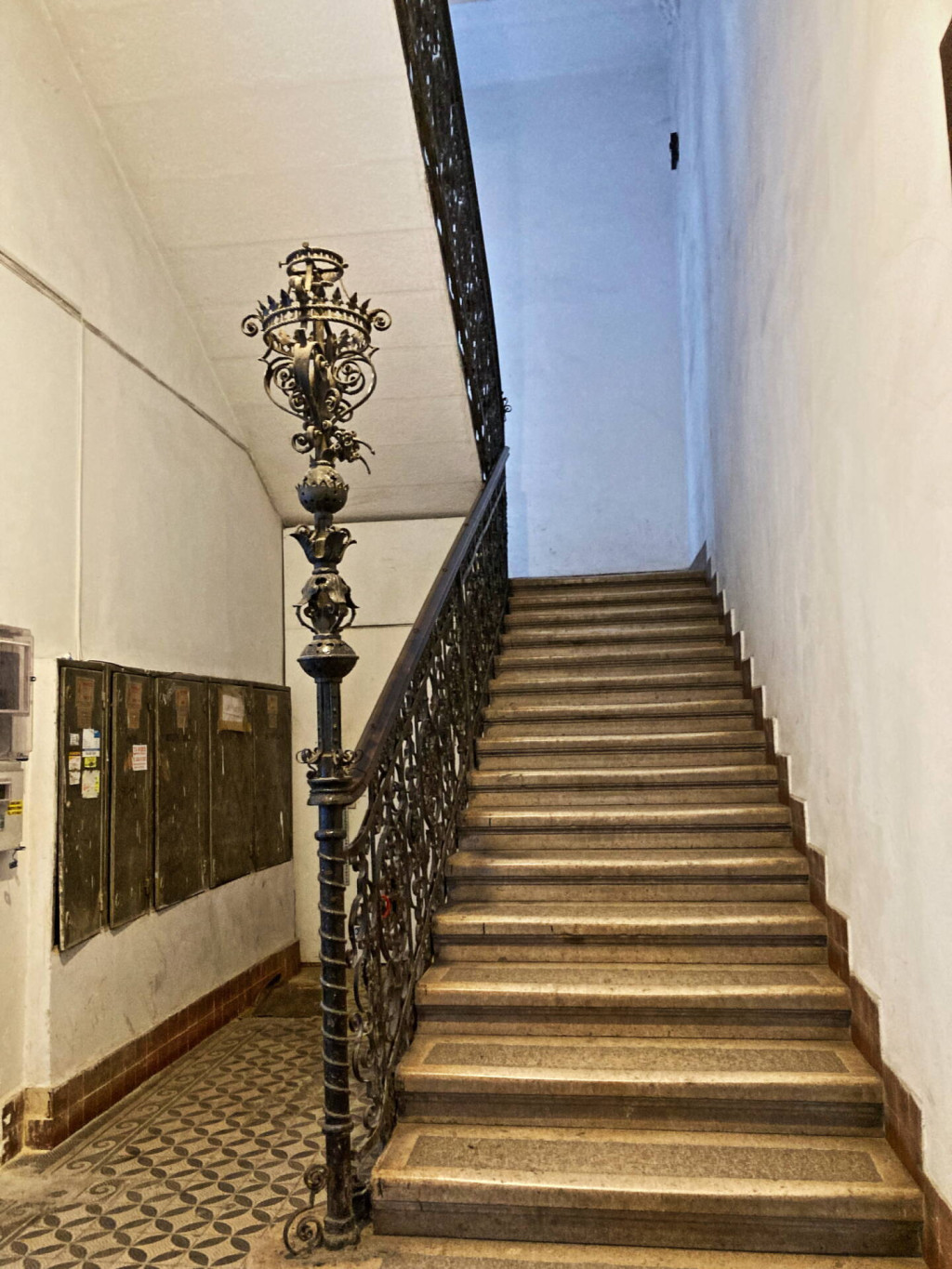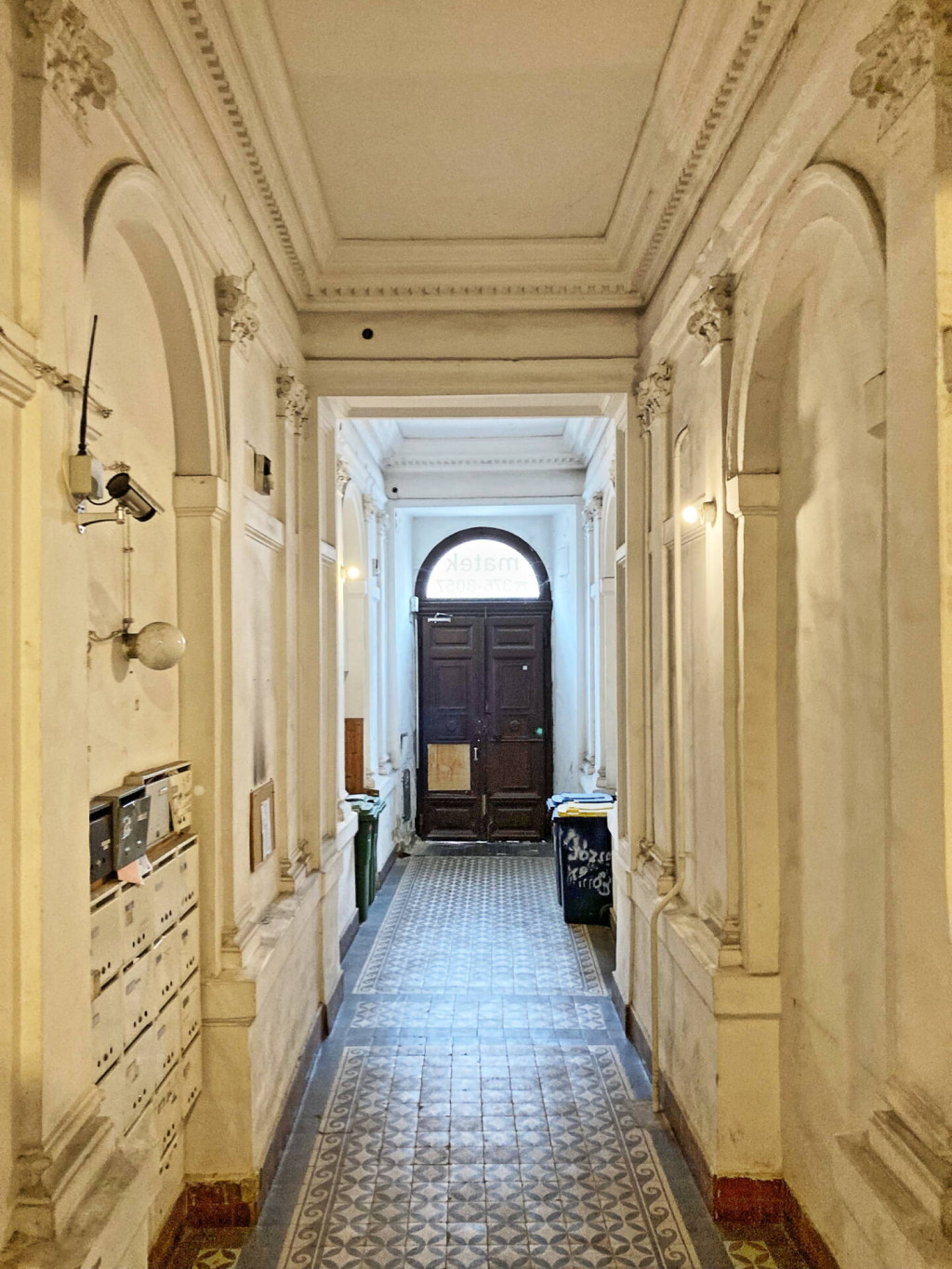 Az eladásra kínált lakás egy 3 emeletes, 1800-as évek végén épült, jó állapotú társasház, 2. emeletén helyezkedik el, a körfolyosó utolsó lakásaként, így senki nem jár el a bejárati ajtó előtt. A ház homlokzata jó állapotú, a belső terei kulturáltak, bár egyelőre a felújítás csak a csatornarendszert érintette.