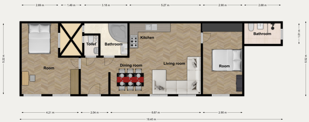 Igény esetén komolyabb átalakítás nélkül is használható, bérbeadható.