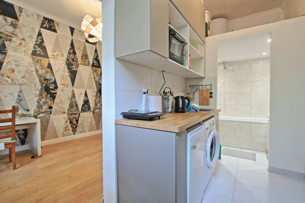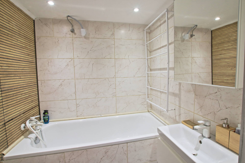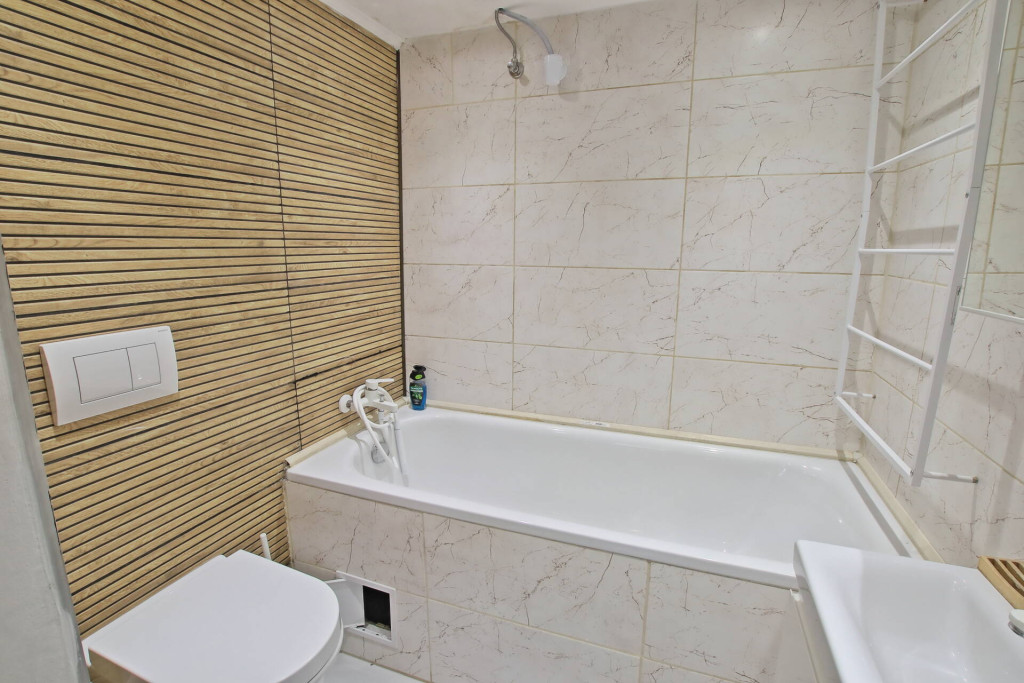 A felújítás során a burkolatok mellett az elektromos és a vízhálózatot is kicserélték, valamint ötletes konyhabútort építettek.