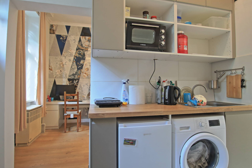 Az ingatlan korszerű, műanyag bejárati ajtaján belépve a konyhába érkezünk, ahol egy kis étkezőasztal is elfér. A helyiség végén alakították ki a fürdőkáddal felszerelt, minden igényt kielégítő fürdőszobát. A szép és igényes laminált parkettával burkolt szobák műanyag, szigetelt ablakai a belső udvarra néznek, a lakás melegét gázkonvektorok biztosítják. A nagyobb szobában egy fekvő galériát is kialakítottak a kényelmesebb helykihasználás érdekében. Ennek a helyiségnek a felújítása során az egyik falról teljesen eltávolították a vakolatot, különleges hangulatot kölcsönözve ezzel a hálószobának. A másik szobában dekor tapétával dobták fel a teret, mely a jól megválasztott padlóval és a délután besütő napfénnyel különösen kellemes nappali szoba lehet.