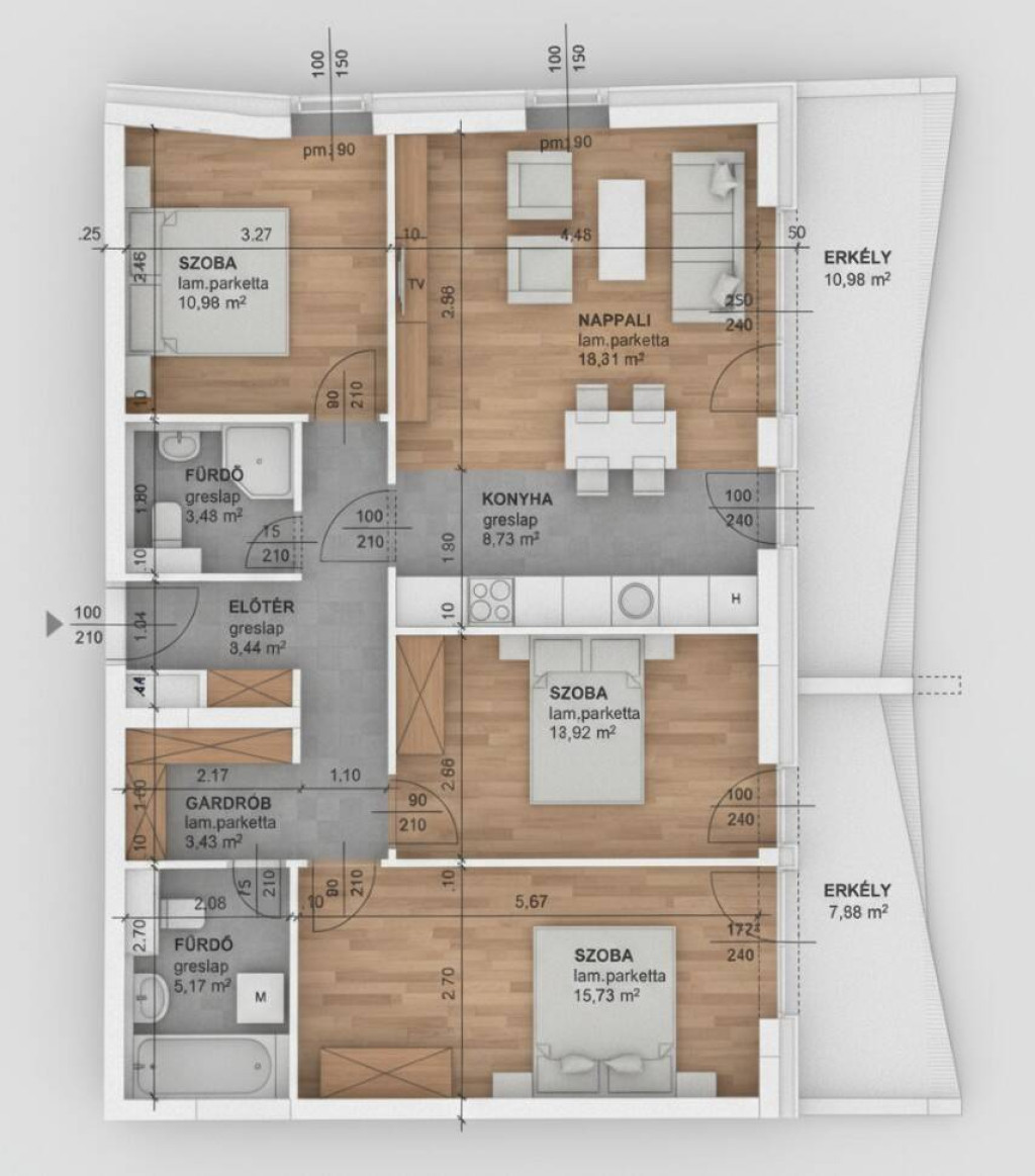 Az ingatlan napfényes, jól kihasznált terekkel rendelkezik, elrendezése ideális családok számára vagy hosszú távú befektetésnek is kiváló választás.