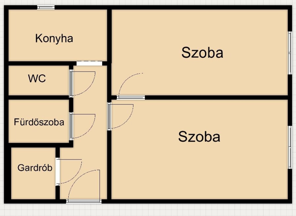 Belépve a járólappal burkolt közlekedőből balra két egymásba nyíló világos tágas kényelmes szoba található, a hálószobában klíma teszi kellemesé a hőmérsékletet nyáron, mivel egybe nyílnak a szobák ezért lehűti mindkettőt. A szobákat laminált parkettával burkolták. Szemben nyílik a kádas fürdőszoba és külön helyiségben a toalett. Tovább növeli a kényelmet a gardrób szoba ami a bejárati ajtó mellett közvetlenül ad teret a család dolgainak az elhelyezésére. Szemben a közlekedő végéből nyílik a tágas, ablakos , gépesített konyha amelyben egy étkező sarok kialakítására is van lehetőség. A nyílászárókat műanyagra cserélték.
