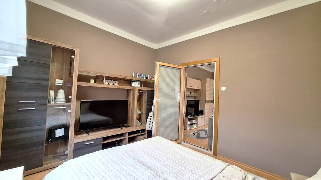 Praktikus elrendezés: A nappaliból külön nyíló hálószoba és egy gardróbhelyiség biztosítja a kényelmet és a rendszerezettséget.