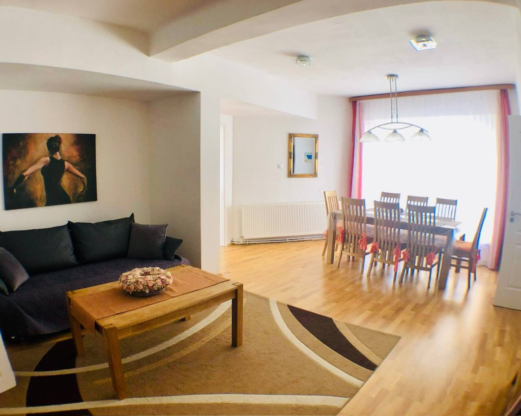 The apartment’s bedrooms face directly onto the Mura River, offering stunning views and a calm, relaxing environment.