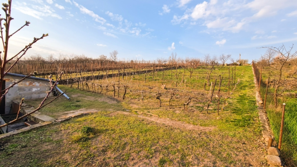 A kertben gyümölcsfák, és szőlő is található,