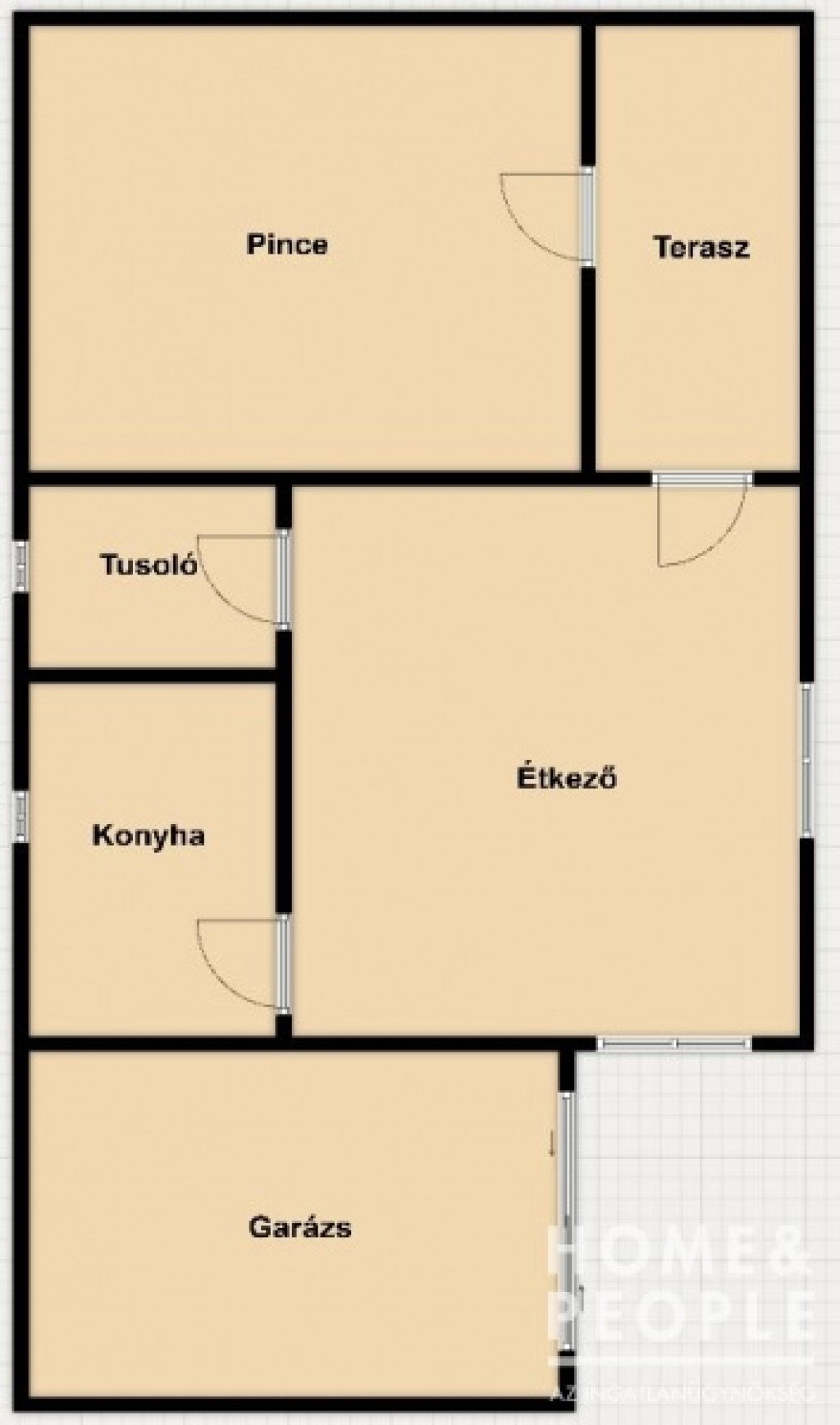 földszinten: étkező, konyha, fürdő és wc egy helyiségben, terasz és 25m2-es "pince" amiből szoba kilakítható,