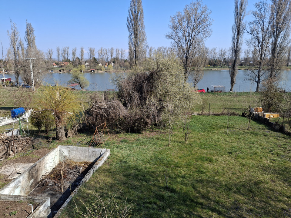 Dányi horgásztóra nyiló kert, panorámás alpesi típusú faház eladó.