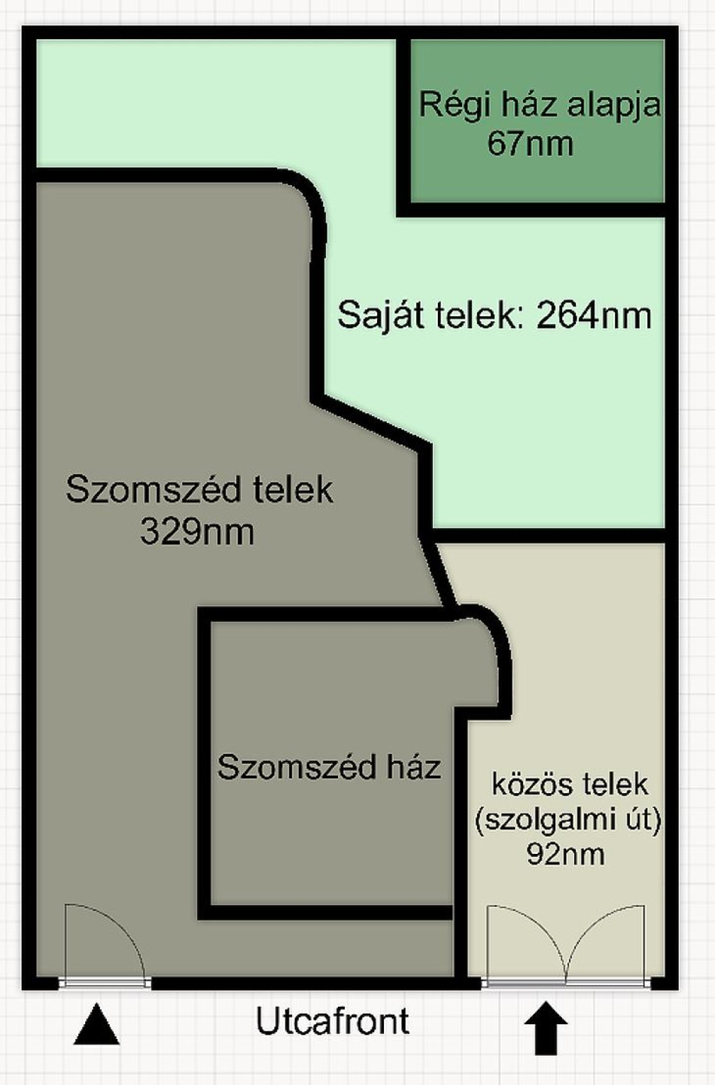 Található rajta egy elkezdett építkezés, amit nem lehet befejezni (csak a téglafalak állnak), de a betonalapra egy 67nm-es ház építhető.
