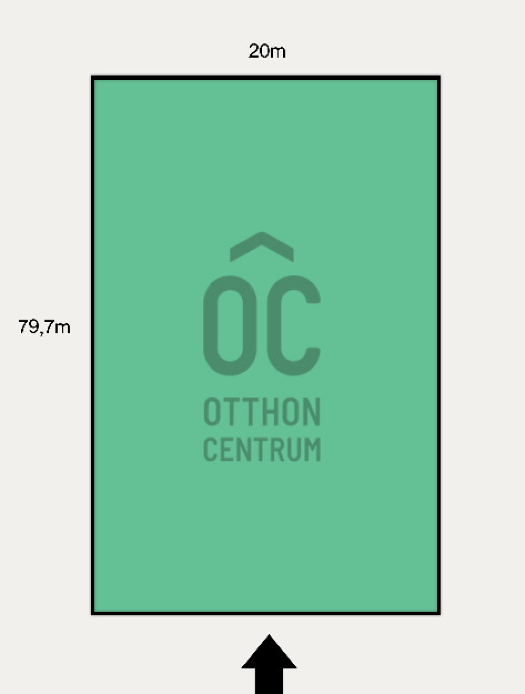 A telek utcafronti szélessége 20m, családi ház, vagy akár ikerház is építhető rá.
