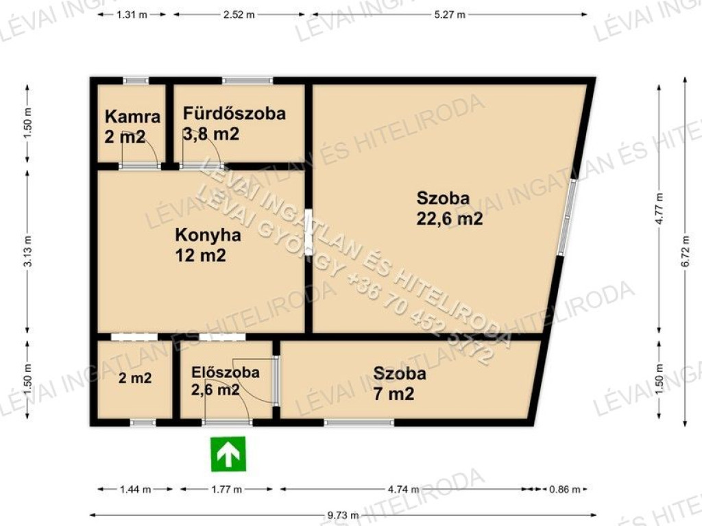 Részei: előszoba, konyha, kamra, 1+1/2 szoba, fürdőszoba (WC-vel).