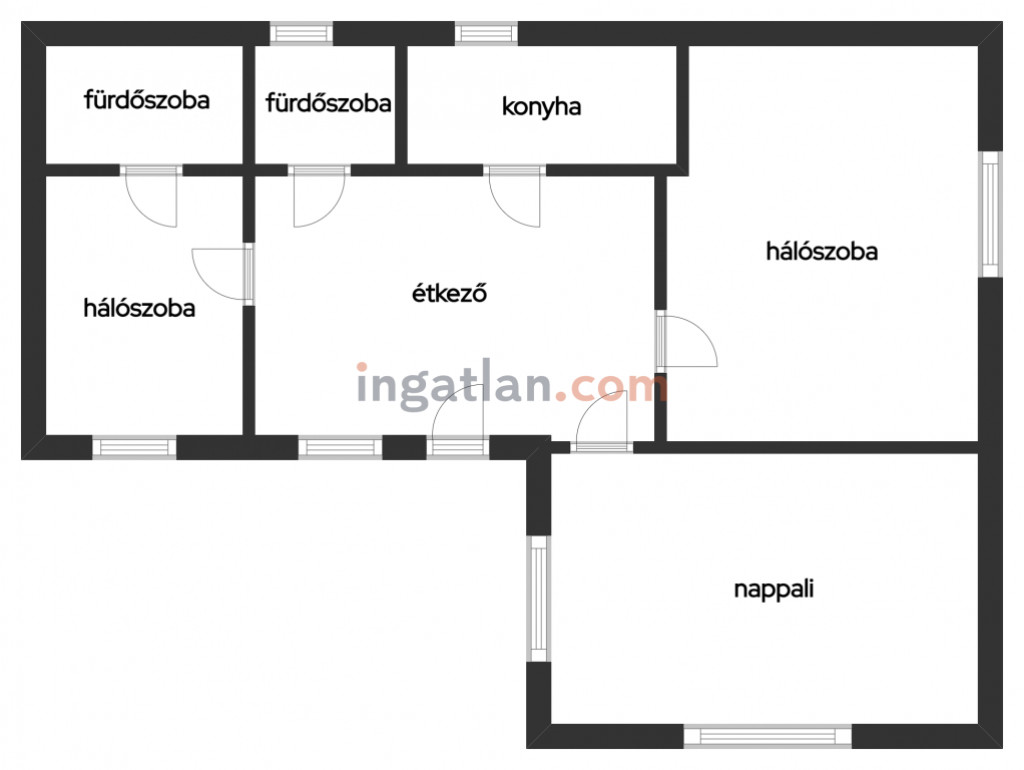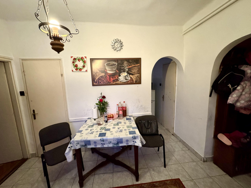 Az ingatlan alapvetően közepes állapotú, némi felújítást igényel. Két rendkívül tágas, jó méretű szobából áll, egy kisebb hálószobából, dupla fürdő, wc, konyha és egy tágas előtér, mely egyben étkező is. Elosztása kiváló, mivel minden szoba külön nyíló. Konyhája ablakos és kamrával ellátott. Fürdő egyben található a wc-vel, viszont van még egy fürdőszobája. Tágas terasza kb. 30 m2 az utca irányába néz. Kint található egy tároló helyiség is.