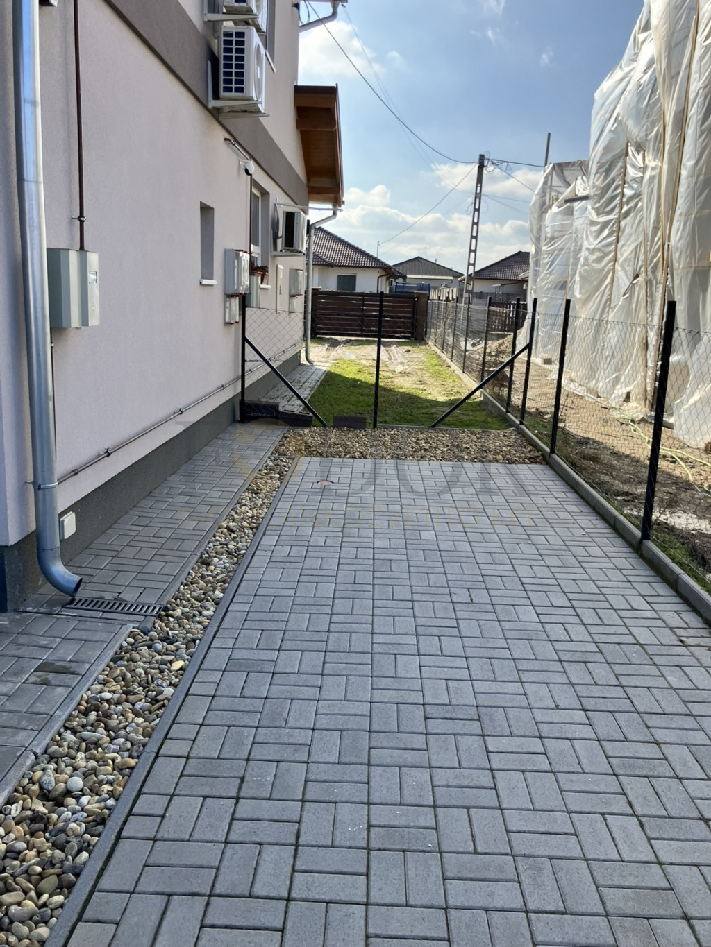 A 360 m²-es telekrészre motoros nagykapun keresztül juthatunk be, ahol a térkövezett beállón akár 3 autó is zártan parkolhat.