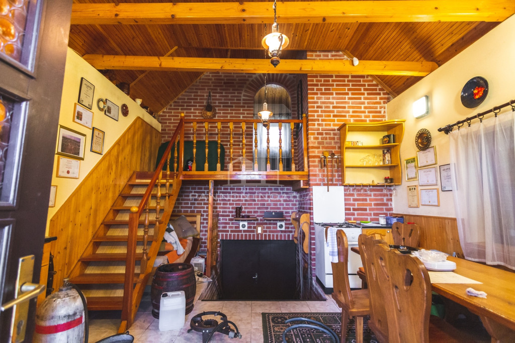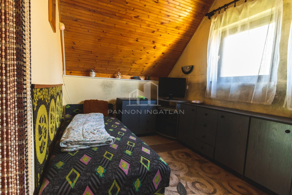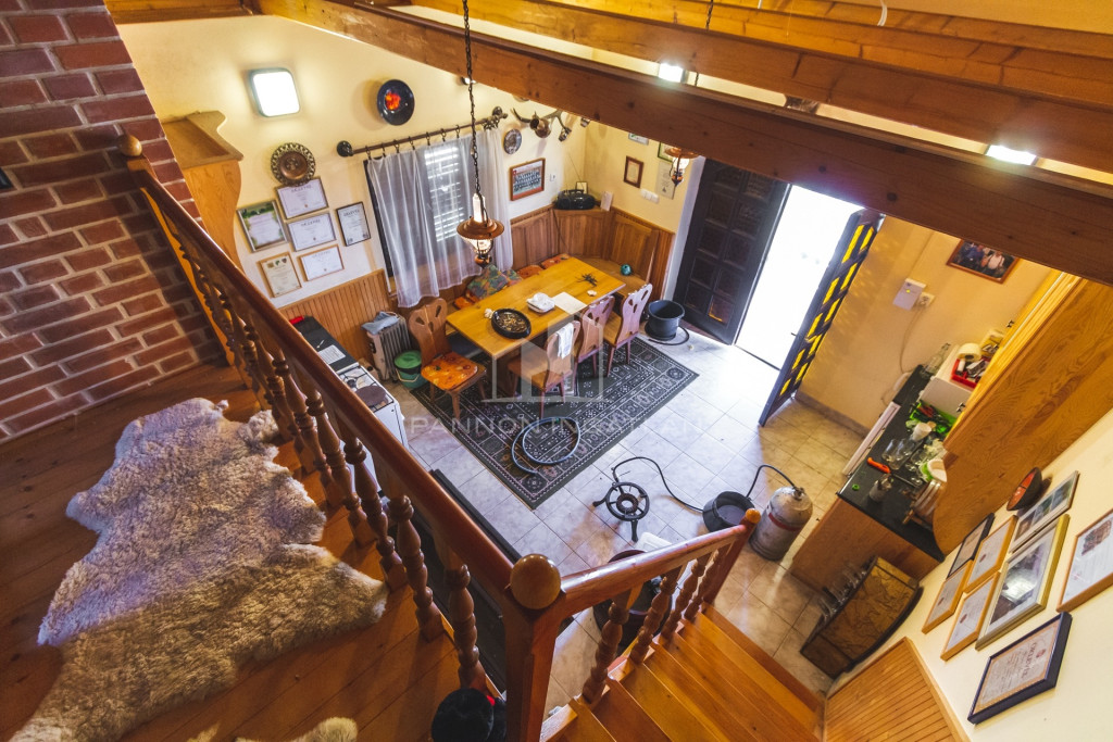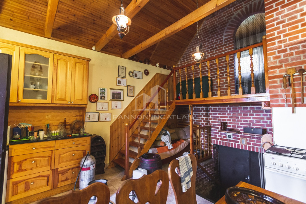 Az 1990-ben épült tégla építésű kis ház 40 m² hasznos alapterülettel, KONYHÁVAL, ÉTKEZŐVEL ÉS EGY GALÉRIÁS HÁLÓSZOBÁVAL rendelkezik, ahol a fagerendák alatt nyugodtan lehet éjszakázni.