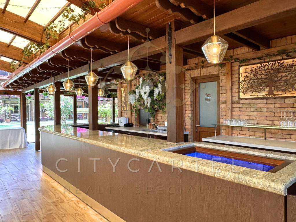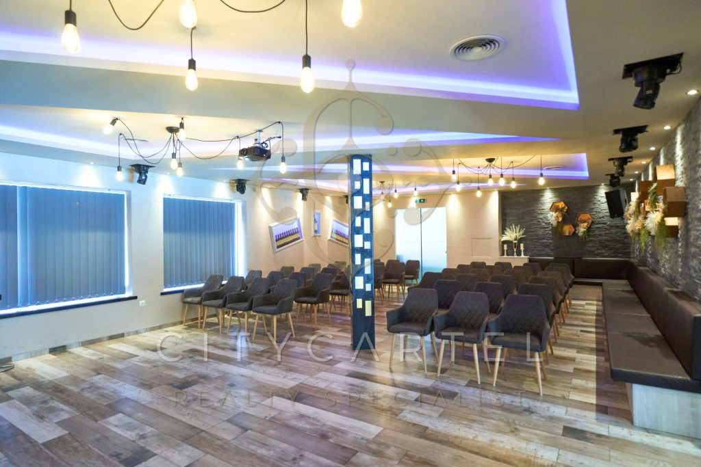 Az utcafronti sarok épületben található étterem és rendezvényközpont összesen br 501 nm (nettó 454 nm), ebben benne van a 132 nm-es, fedett üvegezett étterem/rendezvényterem, 118 nm-es rendezvényterem, 67 nm-es bár, a wellness, szauna, gőzkabin, konyha, iroda és kiszolgáló helyiségek, raktár, mellékhelyiségek.