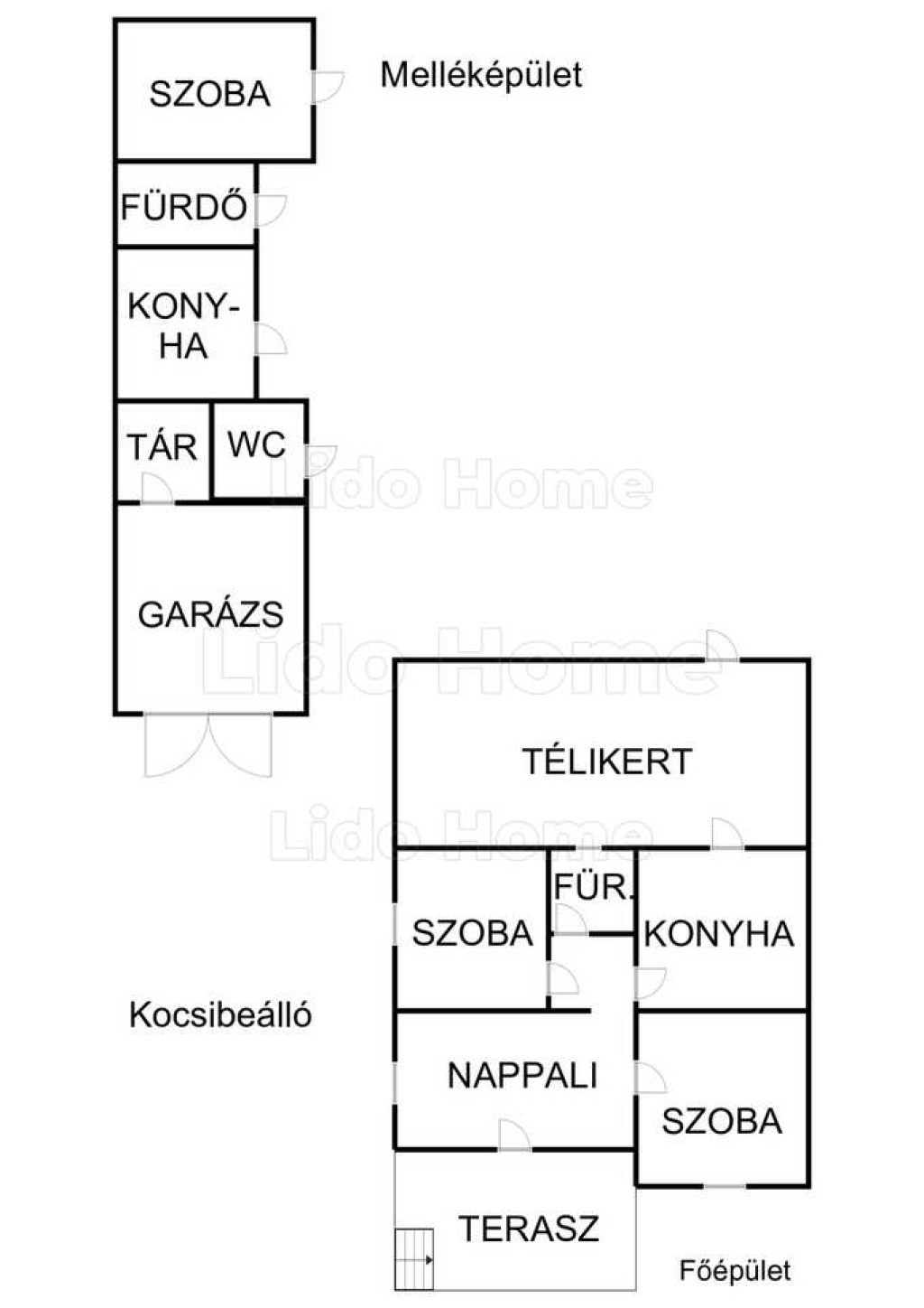 A ház beosztását tekintve az utcafronti épület nappali, 2 hálószoba, konyha, fürdőszoba ,télikert helyiségkiosztású.