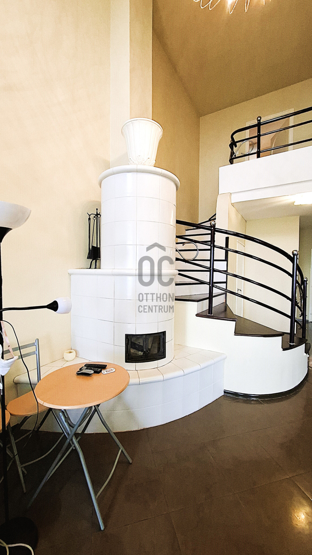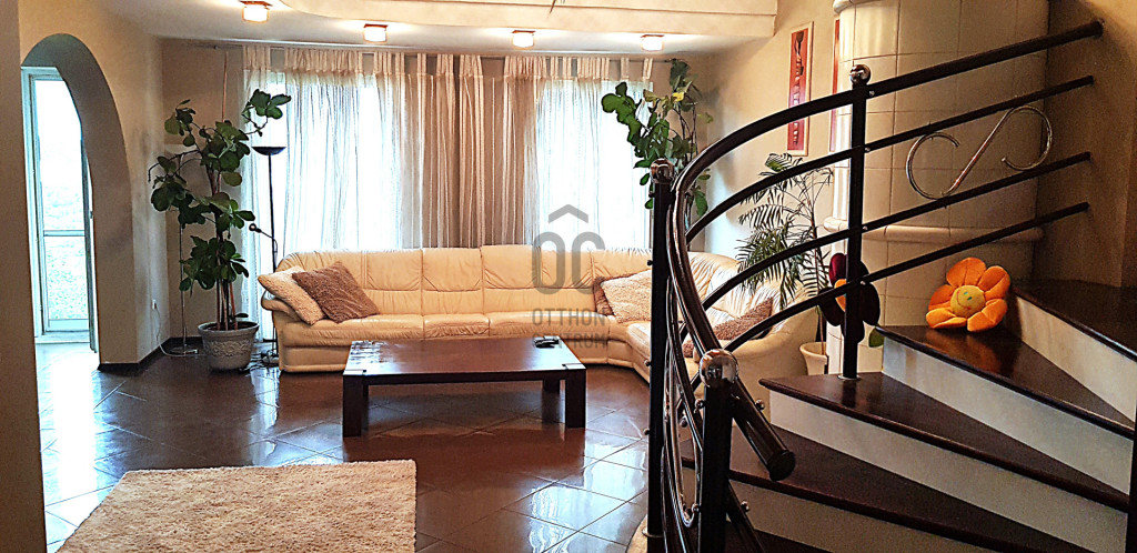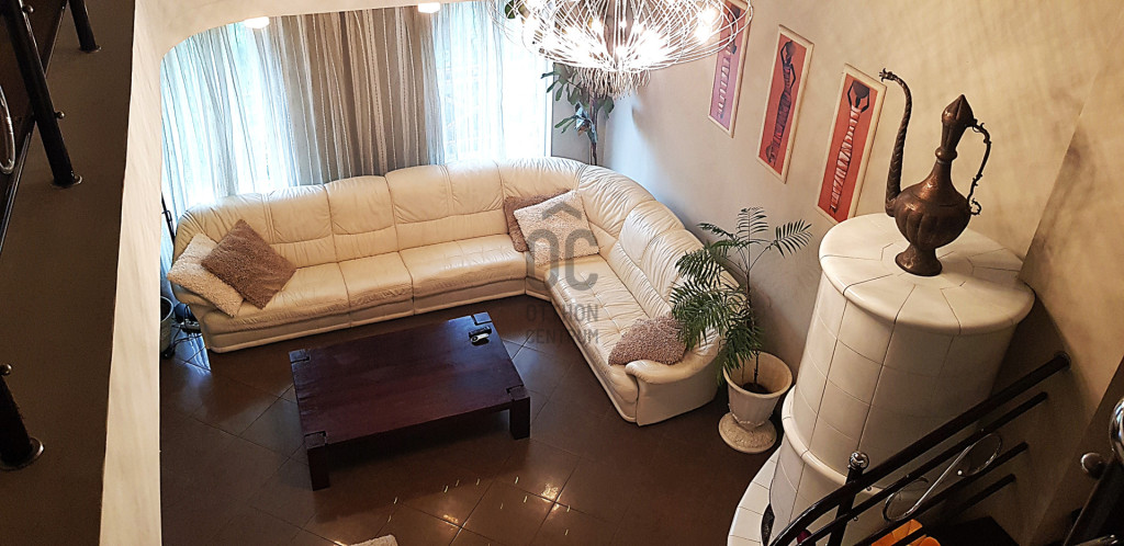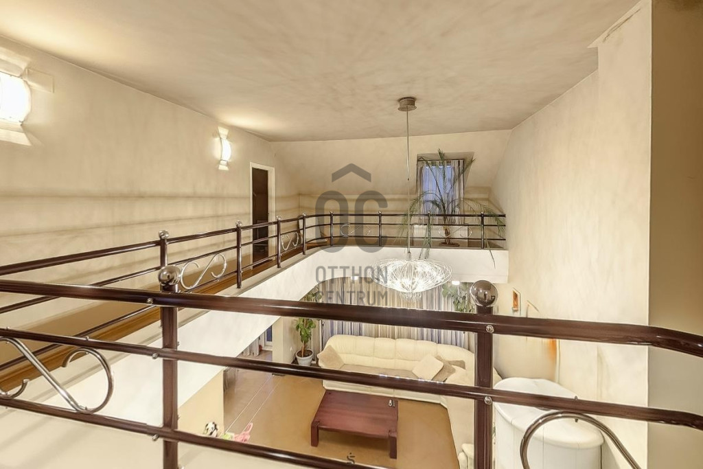 Fent: Hatalmas, felújított, modern lakás, különleges, átriumokkal, amik nagyvonalú tereket biztosítanak. A lakás a konyha-étkező valamint nappali mellett három hálószobával rendelkezik a felső szinten.